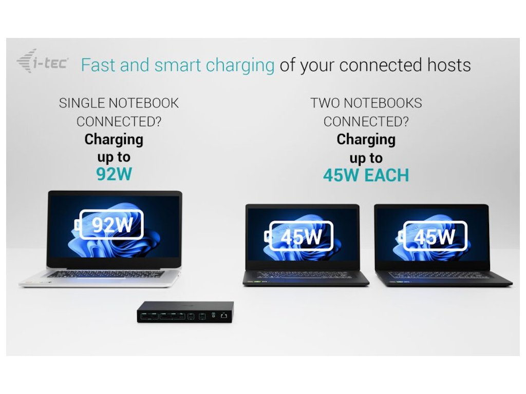 Stanice podporuje USB-C Power Delivery s výkonem až 92 W pro jedno zařízení nebo 45 W pro dvě zařízení současně, což eliminuje potřebu dodatečných napájecích adaptérů. S podporou USB 3.2 Gen 2 nabízí vysokorychlostní přenos dat až 10 Gbps a poskytuje kompletní konektivitu včetně Ethernetu a audio portů.