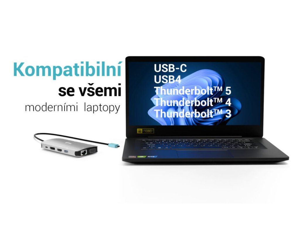 Dokovací stanice je kompatibilní se zařízeními s portem USB-C, USB4 nebo Thunderbolt 3/4/5. Pro funkci video výstupu je vyžadován port s podporou alternativního režimu DisplayPort nebo Thunderbolt 3/4/5. Pro Power Delivery je nutná podpora této funkce na straně připojeného zařízení.