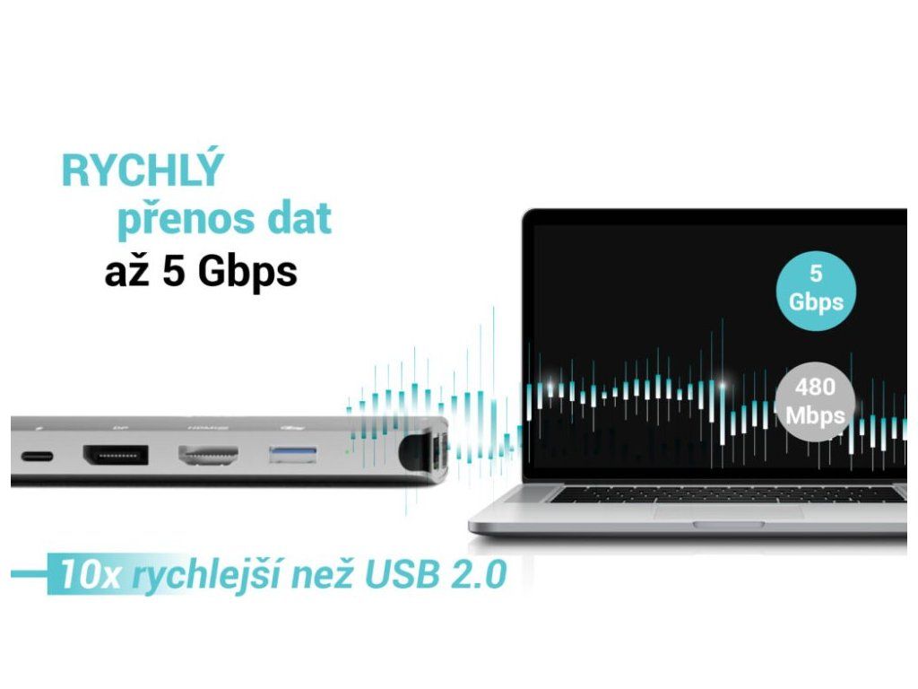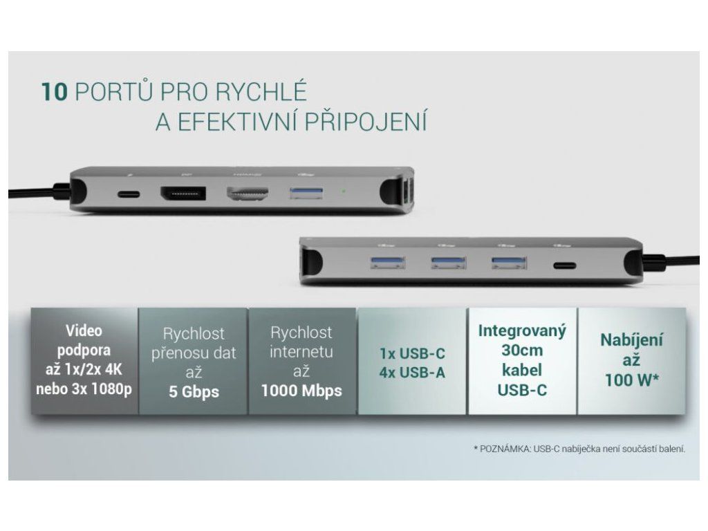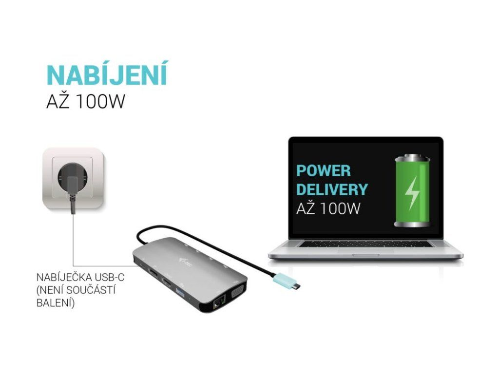 - Power Delivery až 100 W pro nabíjení připojeného notebooku nebo tabletu jedním kabelem