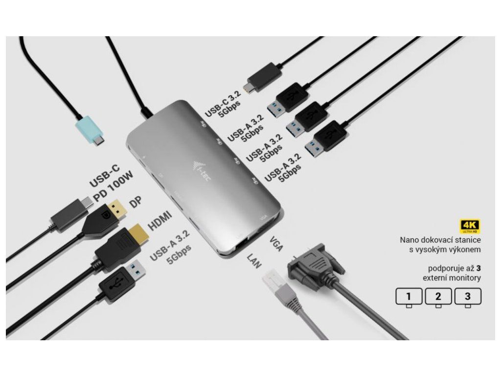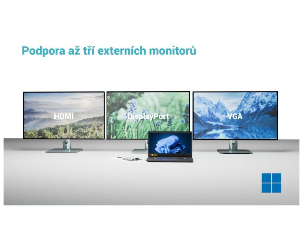 Dokovací stanice nabízí kombinaci HDMI 2.0, DisplayPort 1.2 a VGA, díky čemuž snadno připojíte moderní i starší monitory. Podporuje rozlišení až 4K/60 Hz při připojení jednoho monitoru, případně více monitorů současně (až 3× 1080p/60 Hz). Technologie USB-C MST (Multi Stream Transport) umožňuje efektivní správu více displejů. Tělo z kvalitního hliníku zajišťuje dostatečnou odolnost při každodenním používání i na cestách.