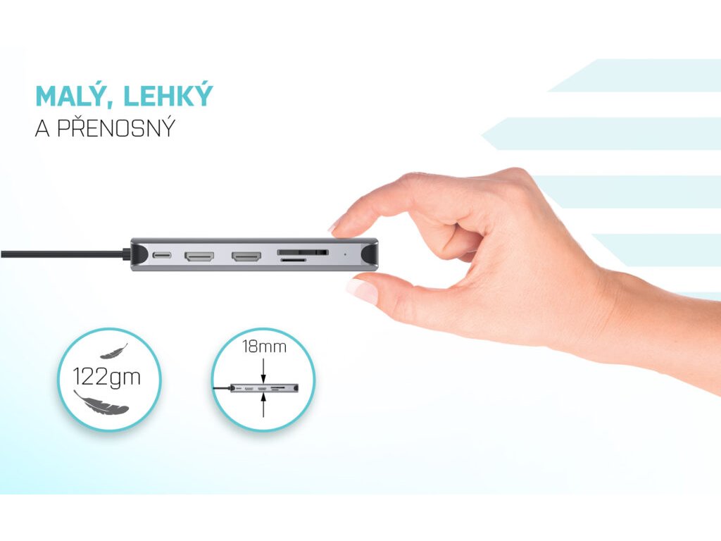 • Vysoce výkonná cestovní dokovací stanice až pro tři monitory současně • Dokovací stanice je kompatibilní s téměř jakýmkoli současným notebookem (připojení přes porty USB 3.0, USB-C, USB4 nebo Thunderbolt™ 3/4). • Port HDMI 1 podporuje vysoké rozlišení až 4K • Nativní podpora portu VGA pro starší displeje nebo projektory • 5x portů USB (1x USB-C, 1x USB 3.2 a 3x USB 2.0) umožňuje snadné připojení zařízení a periferií USB • Sloty SD/microSD pro snadný přenos dat z paměťových karet • GLAN Ethernet podporuje síťové rychlosti 10/100/1000 Mb/s a poskytuje robustní a vysokorychlostní připojení k internetu. • Dokovací stanice podporuje až 100W napájení připojeného notebooku nebo tabletu Popis Výkonná, přesto však malá a přenosná dokovací stanice, která podporuje výstup až na tři externí monitory. Dok lze použít prakticky s jakýmkoliv notebookem, neboť podporuje připojení ke všem obvyklým portům: USB 3.0, USB-C, USB4 a Thunderbolt“ 3/4, a zároveň podporuje všechny běžné současné operační systémy. Připojení ke třem monitorům však bude možné pouze v případě notebooku s portem Thunderbolt“ 3/4, případně USB-C portem podporujícím přenos videa (tzv. USB-C DP Alt mode). 5 USB portů, spolehlivé a rychlé připojení do podnikové sítě díky integrovanému LAN portu a nativní podpora VGA, to vše z této dokovací stanice dělá ideálního společníka pro profesionály, kteří jsou na často na cestách a potřebují připojení i ke starším monitorům a projektorům. Samozřejmostí je podpora nabíjení vašeho notebooku či tabletu (a to až 100W). • Připojte až 3 externí monitory* • Power delivery: až 100 W • K dispozici jsou 2 porty HDMI* a jeden VGA port • 1x USB 3.2, 1x USB-C a 3x USB 2.0 vám umožní snadné připojení vašich USB zařízení a • Gigabitový Ethernet RJ-45 poskytuje spolehlivé, robustní a vysokorychlostní internetové připojení s podporou 10/100/1000 Mbps rychlostí • Sloty SD a microSD pro snadné přenášení dat z paměťových karet • Podporuje Windows 10/11, macOS, Android, Linux a ChromeOS * Port HDMI 1 bude fungovat pouze v případě připojení k notebooku s portem ThunderboltTM 3/4, USB4, případně USB-C portem podporujícím přenos videa (tzv. USB-C DP Alt mode) V případě, že je dokovací stanice připojena přes USB 3.0, nabíjení notebooků a tabletů nepodporuje Specifikace • Integrovaný 30 cm kabel USB-C obsahuje adaptér USB-C na USB 3.0 • Power Delivery: 100 W • Video Porty: - 2x HDMI* - 1x VGA • Rozlišení: - 1 monitor – 1x HDMI 1 až 4K/30Hz - 1 monitor – 1x HDMI 2 až 1080p/60Hz - 1 monitor – 1x VGA až 1080p/60Hz - 2 monitory – HDMI 1 + HDMI 2 až 4K/30Hz + 1080p/60Hz - 2 monitory – HDMI 1 + VGA až 4K/60Hz + 1080p/60Hz - 2 monitory – HDMI 2 + VGA až 2x 1080p/60Hz - 3 monitory – HDMI 1 + HDMI 2 + VGA až 4K/30Hz a 2x 1080p/60Hz • 1x USB-C 3.2 port Gen. 1 (pouze pro data) • 1x USB-C PD port (power delivery only) • 1x USB-A 3.2 port Gen. 1 • 3x USB-A 2.0 • 1x SD slot • 1x microSD slot • 1x Ethernet GLAN RJ-45 port (DL 3900) • LED indikace • OS: Windows 10/11, macOS, Linux, Android, ChromeOS s nejnovějšími aktualizacemi • Jednoduchá instalace ovladačů (Windows, macOS, Ubuntu, Android) • Rozměry produktu: 127 x 60 x 18 mm • Hmotnost produktu: 122g • Rozměry balení: 190 x 98 x 23 mm • Hmotnost balení: 140g Hardwarové požadavky: • Zařízení s volným USB-A, USB-C, USB4 nebo Thunderbolt™ 3/4 portem Požadavky pro funkci Power Delivery: • Zařízení s volným USB-C, USB4 nebo Thunderbolt™ 3 portem s podporou „Power Delivery“ Požadavky pro video výstup z portu HDMI 1: • Zařízení s volným USB4, USB-C portem s podporou “DisplayPort Alternate Mode” nebo Thunderbolt™ 3/4 portem Operační systém: • OS: Windows 10/11, macOS, Linux, Android, ChromeOS s nejnovějšími aktualizacemi * Port HDMI 1 bude fungovat pouze v případě připojení k notebooku s portem ThunderboltTM 3/4, USB4, případně USB-C portem podporujícím přenos videa (tzv. USB-C DP Alt mode) Obsah balení • Produkt • ManuálDodatočné parametre