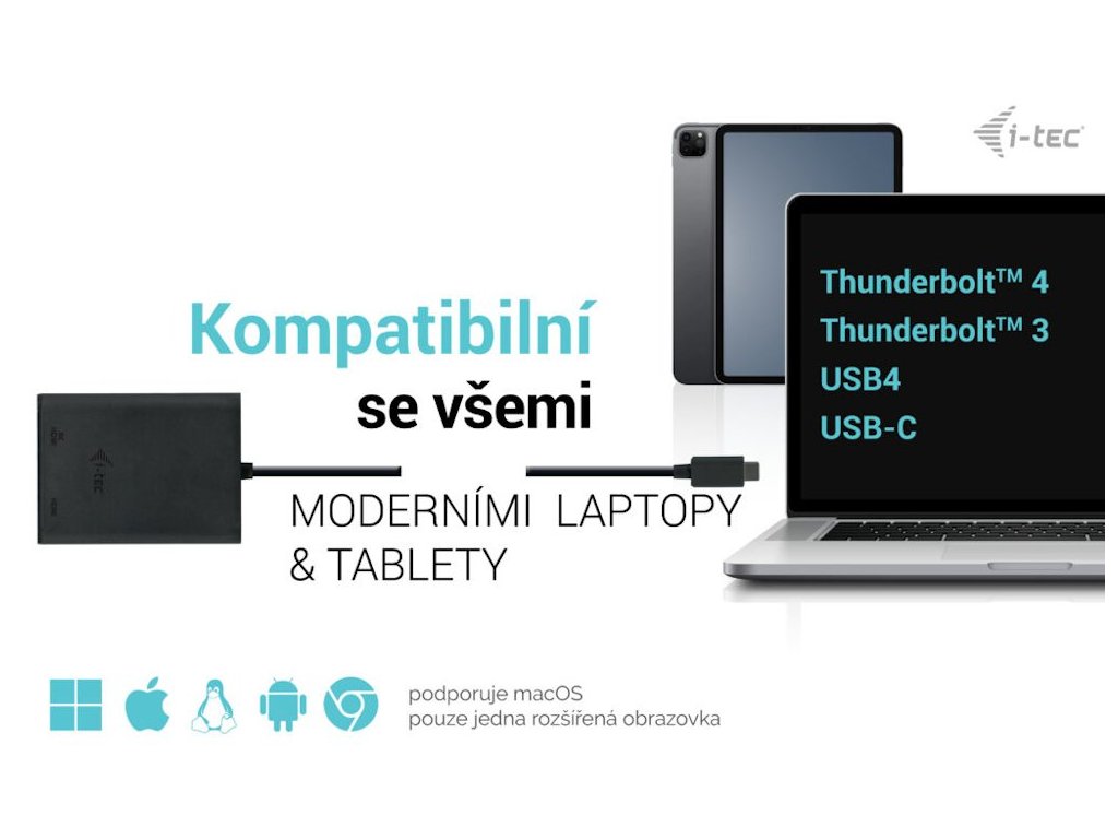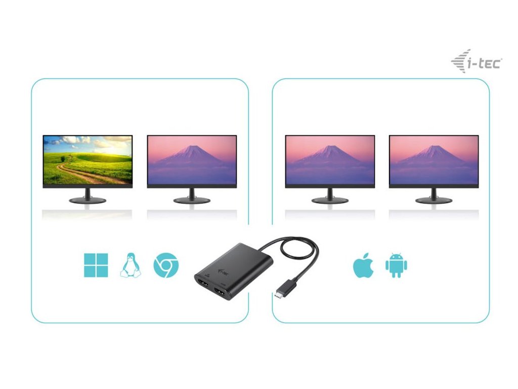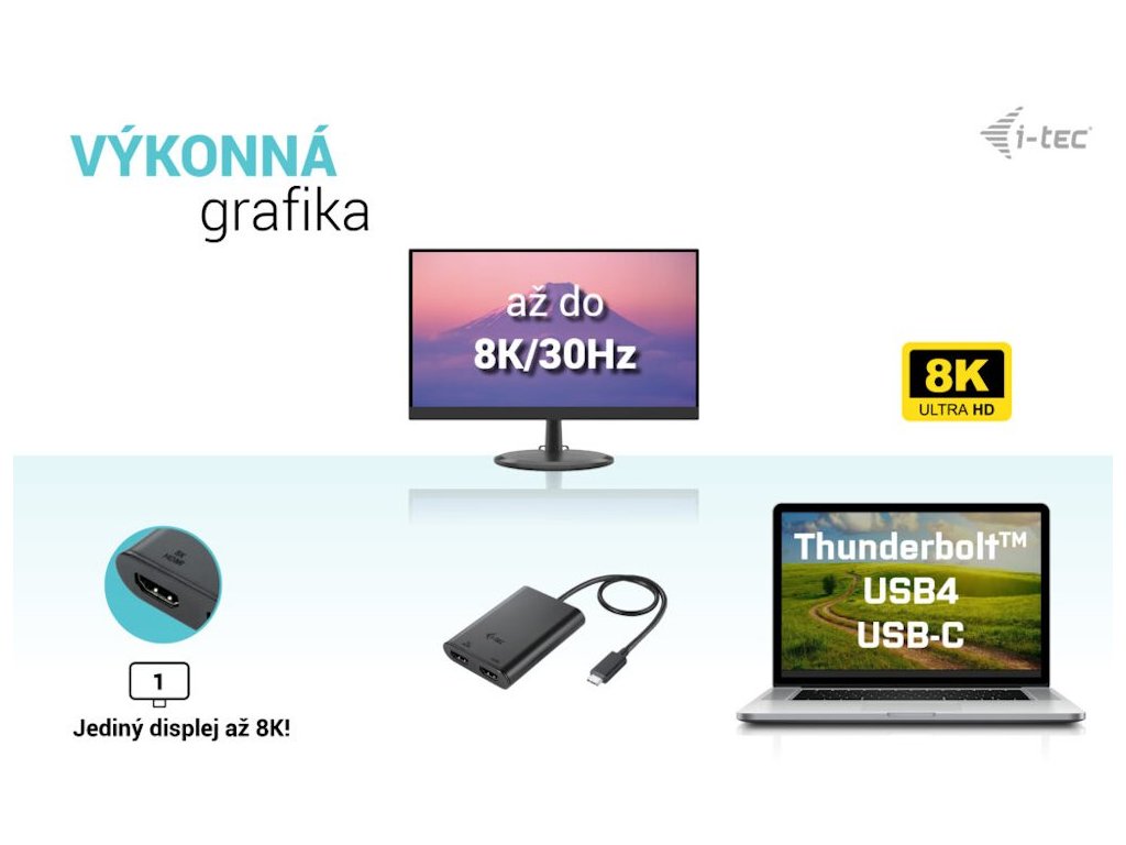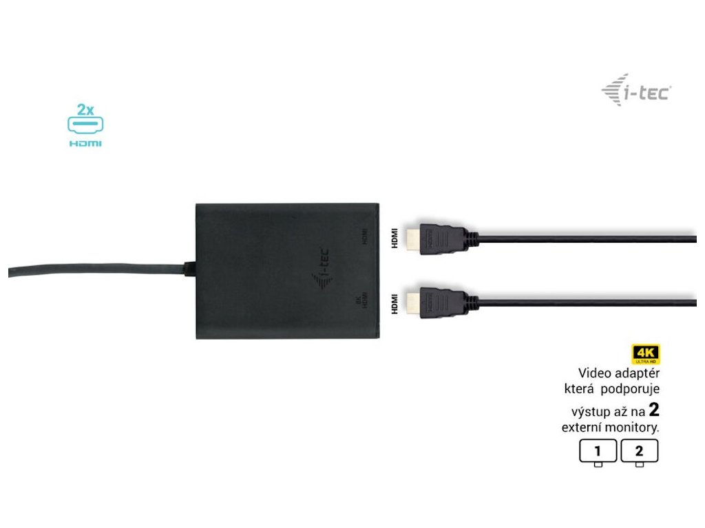 I-TEC USB-C Dual 4K HDMIVideo adaptér, který umožňuje rozšíření vaší pracovní plochy o dva externí HDMI monitory. Připojení lze jednoduše realizovat skrze konektor USB-C, USB 4.0 nebo Thunderbolt 3/4. Adaptér podporuje přenos rozlišení až 1× 8K při 30 Hz nebo až 2× 4K při 60 Hz.