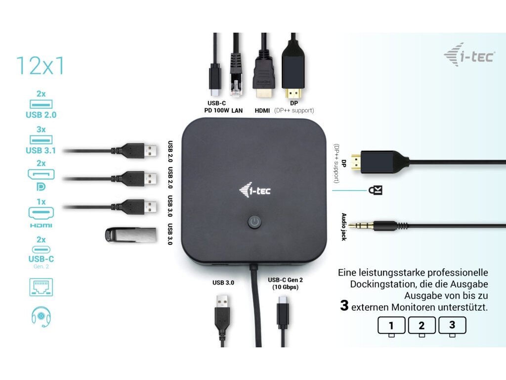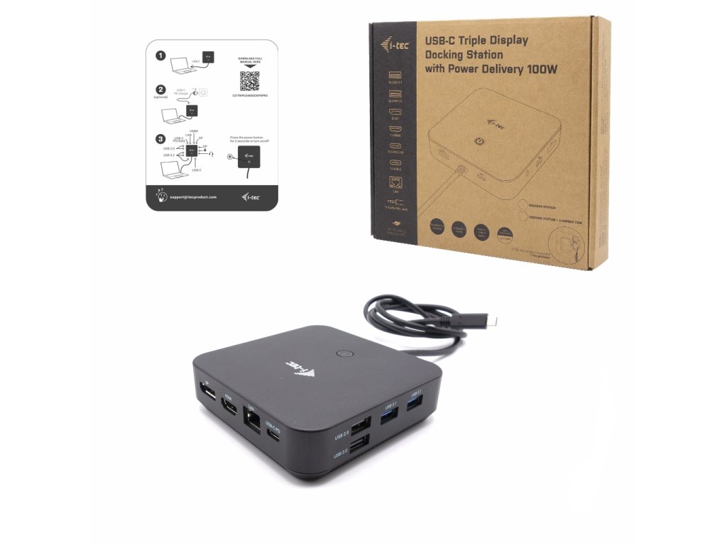 • Kompatibilní s notebooky a tablety s rozhraním USB-C, USB4 a Thunderbolt. (Hostitelské zařízení musí podporovat režim DisplayPort Alt). • 2x DisplayPort++ a 1x HDMI podporující až tři displeje 4K nebo jeden displej 5K/60Hz (v závislosti na výkonu notebooku). macOS podporuje pouze jeden rozšířený displej. • 6x USB-port (5x USB-A, 1x USB-C) usnadňuje připojení více USB zařízení a periferií. • Poskytuje až 100W Power Delivery pro kompatibilní notebooky a tablety s rozhraním USB-C, USB4 a Thunderbolt. • Hostitelské zařízení musí podporovat USB-C Power Delivery. • GLAN Ethernet podporuje síťové rychlosti 10/100/1000 Mb/s a poskytuje robustní a vysokorychlostní připojení k internetu. • Kombinovaný 3,5mm audio vstup/výstup pro snadné připojení náhlavní soupravy nebo reproduktorů. • K dispozici držák VESA, který vám pomůže udržet pořádek na stole a zbavit se kabelů, a slot K-lock pro větší bezpečnost. • Úsporný vypínač pro snížení spotřeby energie, když se dokovací stanice nepoužívá. • Poznámka: Napájecí zdroj není součástí dodávky. Dokovací stanici lze používat s napájecím zdrojem dodávaným s notebookem nebo lze napájecí zdroj zakoupit samostatně, například i-tec CHARGER-C112W/UK Alternativně můžete zakoupit produkt C31TRI4KDPDPRO100/UK, který již obsahuje napájecí zdroj. Vysoce výkonná kancelářská dokovací stanice USB-C, která podporuje až 3x externí monitor v rozlišení 4K. Stanice je kompatibilní s jakýmkoliv notebookem vybaveným portem USB-C, USB4 nebo Thunderbolt 3/4. 6x USB port, spolehlivé a rychlé připojení do podnikové sítě díky integrovanému LAN portu a podpora instalace za monitor, to vše z této dokovací stanice dělá ideálního společníka pro profesionály. Samozřejmostí je podpora nabíjení vašeho notebooku či tabletu, a to až 100 W. Integrovaný nejnovější protokol DP 1.4 DSC podporuje rovněž rozlišení 5K/60 Hz, což mohou ocenit i profesionální grafici, datoví analytici, filmoví editoři, případně milovníci videa ve vysokém rozlišení. Dokovací stanici si můžete zakoupit ve dvou variantách: • bez přiloženého USB-C nabíjecího adaptéru (produktový kód C31TRIPLE4KDOCKPDPRO) • s přiloženým adaptérem o výkonu 100 W (produktový kód C31TRI4KDPDPRO100/UK) Poznámka: operační systém macOS nepodporuje technologii více obrazového video přenosu Multi Stream Transport (MST), což znamená, že v případě připojení k macOS bude na obou připojených monitorech promítnut stejný obraz. • Připojte až tři externí monitory 4K/30Hz • Obnovovací frekvence až 360 Hz (při připojení k jednomu monitoru v rozlišení 1080p) • Power delivery: až 100 W • 1x HDMI, 2x DisplayPort++ • 3x USB 3.1, 1x USB-C 3.2 Gen2 (10 Gbps) a 2x USB 2.0 vám umožní snadné připojení vašich USB zařízení a periferií. Gigabitový Ethernet RJ-45 poskytuje spolehlivé, robustní a vysokorychlostní internetové připojení s podporou 10/100/1000 Mbps rychlostí • Kombinovaný jack pro audio a mikrofon na předním panelu • Zámek Kensington zajistí ochranu proti zcizení, zejména v prostředí sdílených kanceláří či veřejně přístupných míst • Vypínač dokovací stanice umožní maximální úsporu elektrické energie • Dokovací stanice podporuje držák VESA pro inteligentní vertikální instalaci za monitor s VESA podporou • Podporuje Windows 10, macOS, Android, iPadOS, ChromeOS a Linux • Dokovací stanici lze používat i bez připojeného napájecího adaptéru. V takovém případě budou vždy funkční video výstupy, síťový port LAN (RJ-45), audio/mic a oba porty USB 2.0. Porty USB 3.0 a datový port USB-C však při zapojení zařízení s vyššími energetickými nároky (například SSD disky, zejména pak jednotky NVMe) nemusí fungovat. V takovém případě může dojít k vypnutí dokovací stanice. Pro využití všech portů a dosažení maximální rychlosti přenosu dat doporučujeme používat dokovací stanici s připojeným napájecím adaptérem. Poznámka: V případě připojení k zařízení s operačním systémem Android bude dokovací stanice fungovat výhradně s připojeným napájecím adaptérem. Adaptér není součástí balení. Specifikace • 1x integrovaný USB-C kabel pro připojení k zařízení (100 cm) • Technologie dokovací stanice: USB-C (MST) • Power Delivery: až 100 W • Interní spotřeba: 5-10W (bližší info zde) • Video Porty: 2x DisplayPort (podporující DP++), 1x HDMI Rozlišení: DP 1.2 HBR2: • 1 monitor – až 4K/30Hz • 1 monitor – až 1080p/120Hz • 2 monitory – až 2x 1080p/60Hz* • 3 monitory – až 3x 1080p/30Hz* • 3 monitory – až 1x 1080p/60Hz+ 2x 720p/60Hz* DP 1.4 HBR3: • 1 monitor – až 4K/60Hz • 1 monitor – až 1440p/144Hz • 2 monitory – až 2x 1440p/60Hz* • 3 monitory – až 3x 1080p/60Hz* DP 1.4 HBR3 DSC: • 1 monitor – DP až 5K/60Hz, • 1 monitor – HDMI až 4K/60Hz, • 1 monitor – DP až 4K/144 Hz, nebo 1440p/240 Hz, nebo 1080p/360 Hz • 1 monitor – HDMI až 1440p/144 Hz, nebo 1080p/240 Hz • 2 monitory – až 2x 4K/60Hz* • 2 monitory – až 2x QHD/144Hz • 3 monitory – až 3x 4K/30Hz* • 1x USB-C 3.2 port Gen. 2 (10 Gbps) • 1x USB-C 3.2 port Gen. 2 (10 Gbps) + PD (Power delivery) • 3x USB-A 3.2 port Gen. 1 port (5 Gbps) • 2x USB 2.0 port • 1x Ethernet GLAN RJ-45 port • 1x 3,5 mm Combo Audio port • LED indikace • Přepínač ON/OFF pro zapnutí a vypnutí dokovací stanice • Podpora pro Kensington lock • OS: Windows 11, Windows 10, macOS*, iPadOS**, Android**, Chrome OS a Linux s nejnovějšími aktualizacemi • Rozměry produktu: 113 x 113 x 31,2 mm • Hmotnost produktu: 340 g • Rozměry balení: 250 x 242 x 50 mm * Operační systém macOS nepodporuje technologii více-obrazového video přenosu Multi Stream T