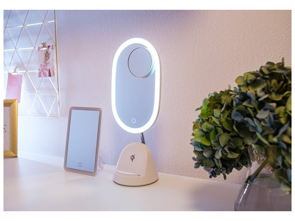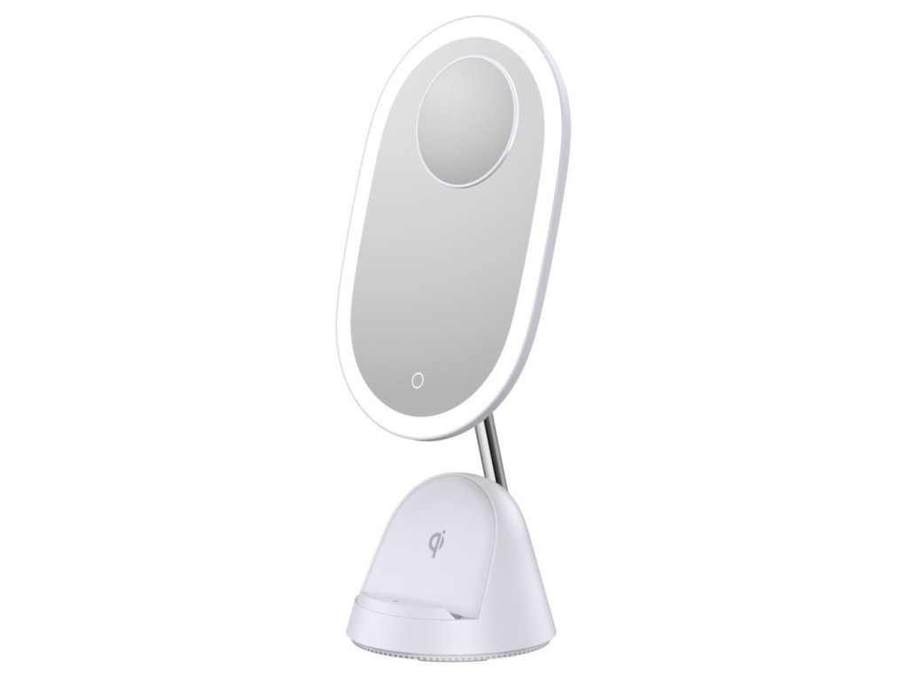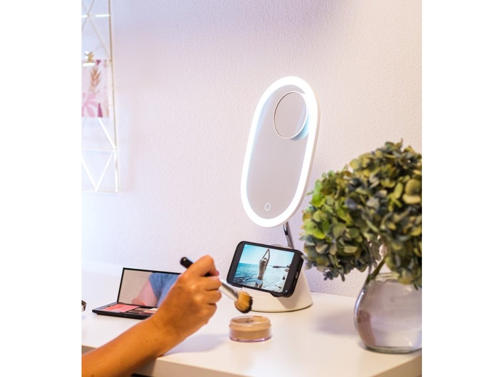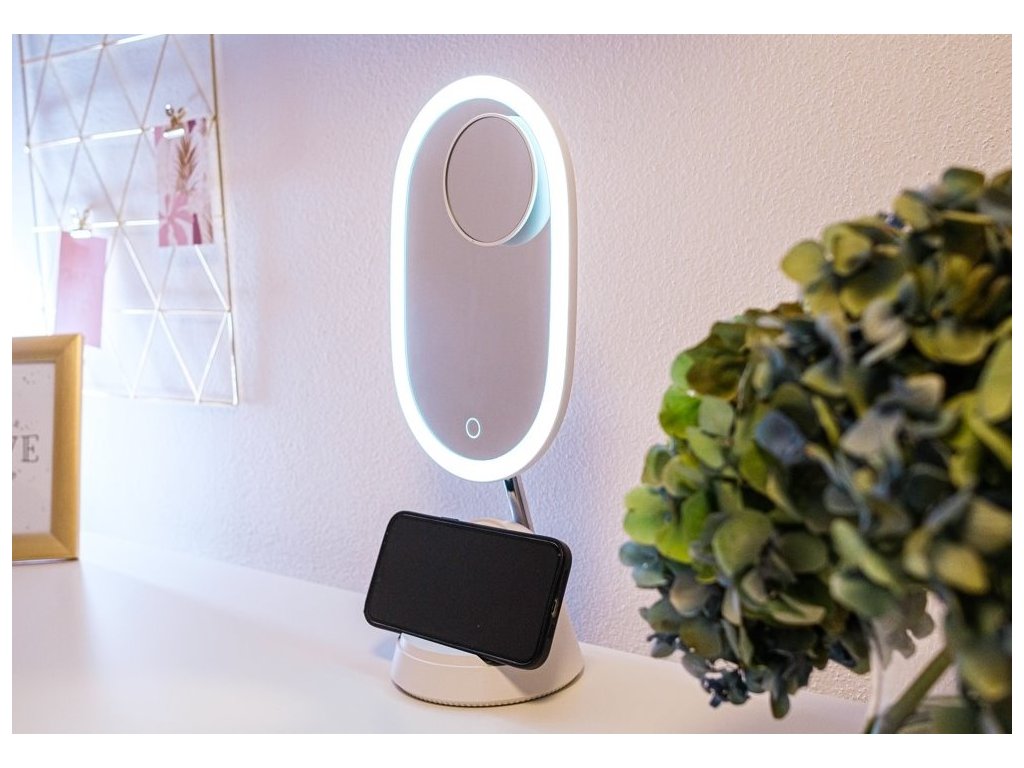 Díky funkci bezdrátového nabíjení Qi můžete svůj přístroj pohodlně napájet, mít ho neustále na očích a během kosmetických úprav vám umožní sledovat film nebo seriál. LED posvícení zajistí dostatečné osvětlení při líčení, nanášení make-upu apod. Přídavné magnetické zrcátko poskytuje až 3× zvětšení pro detailní nalíčení.