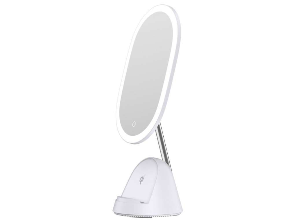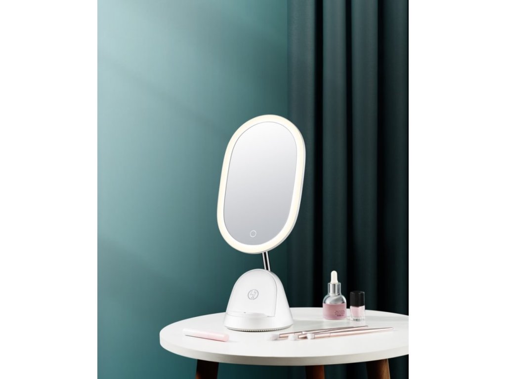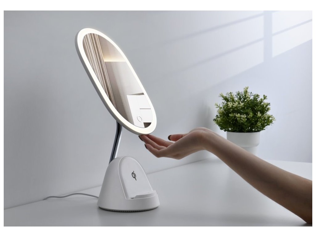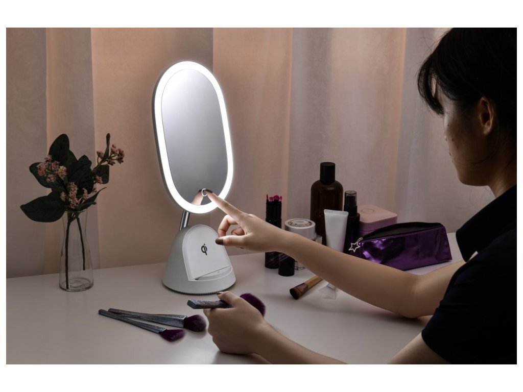 Stolní kosmetické zrcadlo s LED podsvícením je dokonalý pomocník nejen při líčení. 28 vestavěných LED diod neoslňuje ani nezkresluje barvy a jeho oválný tvar komfortně zobrazí celý obličej i oblast krku. Navíc jej lze naklánět v rozsahu 40°, takže vám už neunikne žádný detail. Intenzitu podsvícení je možné nastavit ve třech úrovních pomocí dotykového tlačítka na přední straně zrcadla. Dále nabídne praktický stojánek pro mobilní telefon s bezdrátovou nabíječkou standardu Qi, která poskytuje výkon až 10 W.