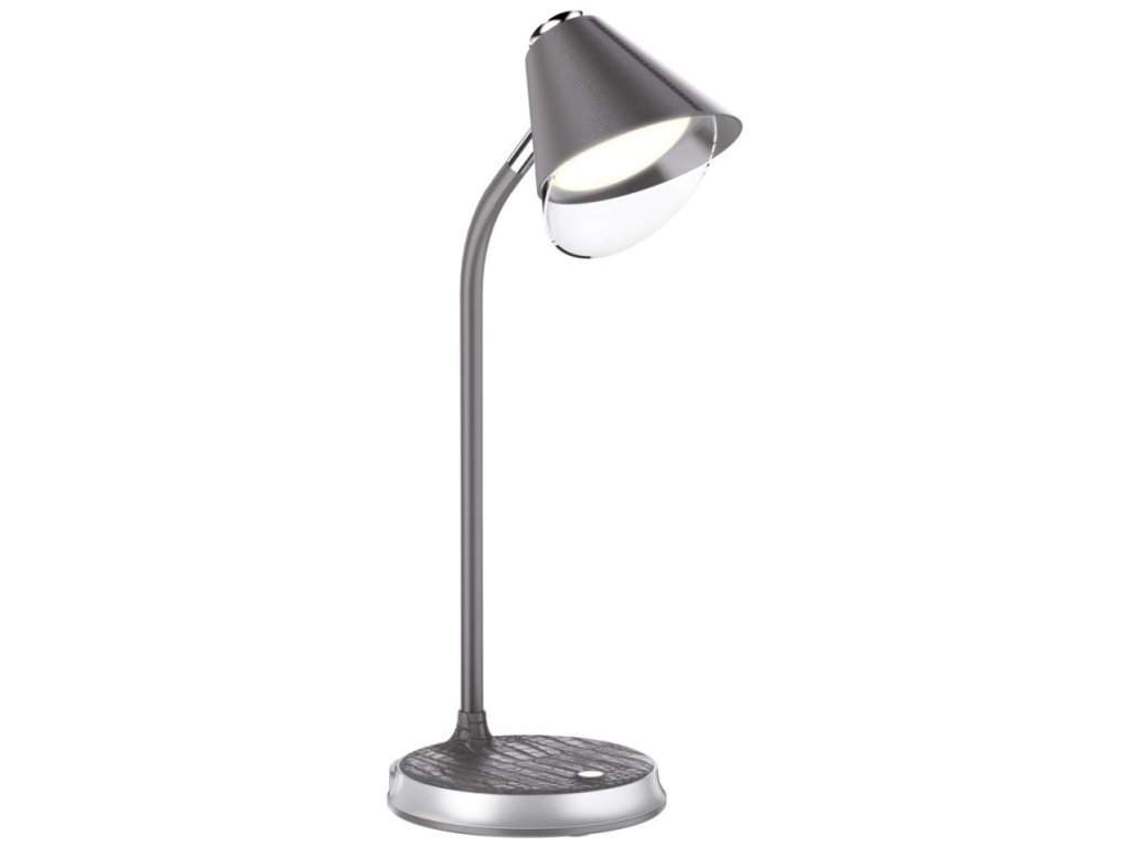 IMMAX FINCHPraktická stolní lampička s pokročilou LED technologií, naklápěcí hlavou a nadčasovým designem. Šedá imitace kůže v kombinaci se stříbrnými prvky z ní dělá také stylový vizuální doplněk, vhodný například do reprezentativních kancelářských prostor. Nastavení intenzity osvětlení i barevné teploty probíhá pomocí jediného dotykového tlačítka. Lampička je vybavena také bezdrátovou nabíječkou standardu Qi nabízející výkon 10 W. Mobilní telefon s podporou bezdrátového nabíjení se začne nabíjet při pouhém položení na nabíjecí plochu.