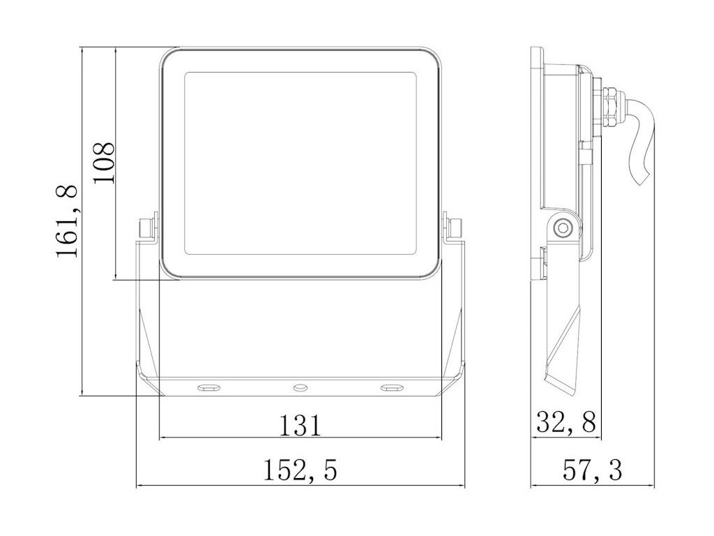 Kompaktní rozměry 131 × 108 × 57 mm bez držáku a hmotnost 310 g usnadňují montáž. Reflektor pracuje se standardním síťovým napětím AC 230 V a nevyžaduje žádné speciální napájecí zdroje.
