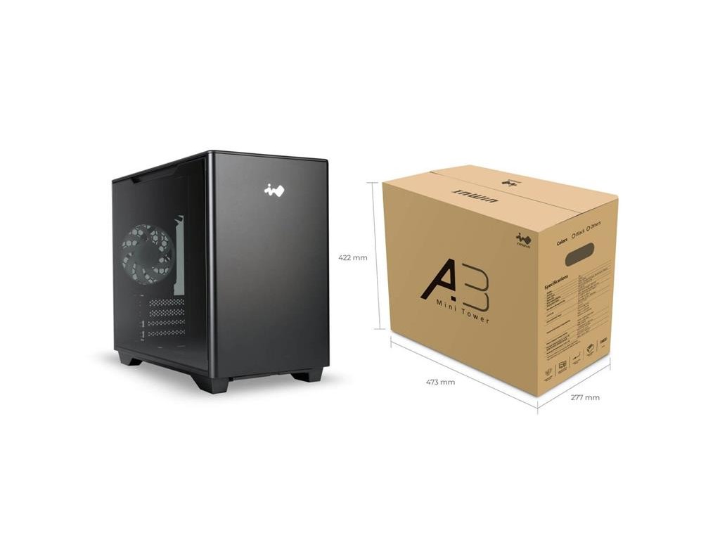 Specifications Model A3 Model Number IW-CS-A3BLK-1AM120S IW-CS-A3WHI-1AM120S Colors Black, White Case Type Mini Tower Materials SECC, Tempered Glass, PC-ABS M/B Compatibility Micro-ATX, Mini-ITX Expansion Slots 4 x PCI-E Maximum Compatibility GPU Length: 340 mm CPU Heatsink Height: 162 mm I/O Ports 1 x USB 3.2 Gen 2x2 Type-C 2 x USB 3.2 Gen 1 HD Audio Combo (CTIA – SPK/Mic) Internal Drive Bays 2 x 3.5" / 2.5" 1 x 2.5" Thermal Solution Compatibility Air Cooling Fans: Top: 2 x 120 mm Rear: 1 x 120 mm Bottom: 2 x 120 mm (1 InWin Mercury AM120S Fan Included) Water Cooling Radiator: Top: 1 x 240 mm Power Supply Compatibility PSII: ATX12V - Length between 140 - 200 mm (PSUs longer than 170 mm will need to build with GPUs 280 mm or shorter) Product Dimensions (L x W x H) 401 x 215 x 347 mm 15.8 x 8.5 x 13.7" Package Dimensions (L x W x H) 473 x 277 x 422 mm 18.6 x 10.9 x 16.6" Net Weight 5.24 kg / 11.55 lbs Gross Weight 6.25 kg / 13.78 lbsDodatočné parametre