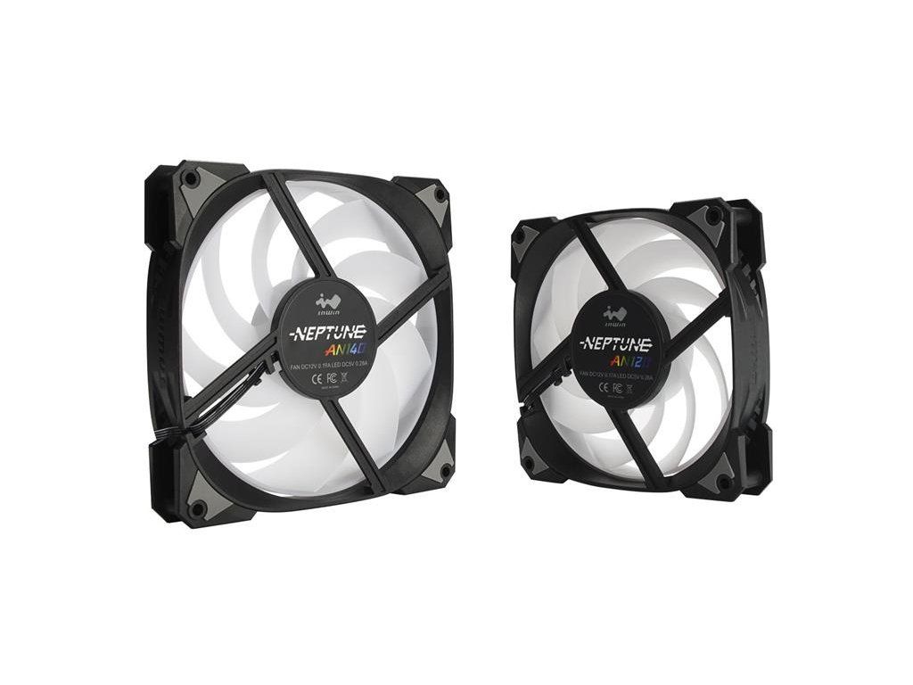 NEPTUNE AN120/AN140 Silent Static Pressure Fan Acoustic Expression: Silence The Neptune AN fans, integrated with innovative aerodynamic blades, maintain efficiency while sustaining a silent, tranquil environment. The 8-individual-ARGB-LEDs enrich the PC’s overall visual aesthetic. Bested the Tested The Neptune fans underwent rigorous testing, fortifying a strong pressure-to-airflow P-Q curve. The critical middle section indicates that the Neptune fans possess high static pressure and airflow that outperforms the competition. True Air Benders Besides enhancing speed, the Neptune series creates a more balanced performance, which includes reducing noise. Turbulence, resonance, and pitch from air dispersal were all taken into consideration. InWin dissected the fan's anatomy to produce these silent high static-pressure fans. InWin’s Semi-Anechoic Chamber’s background noise level is at 17 dB(A). The sound test distance between the fan and the microphone is 1 meter. Turbine Blade Design Experience quiet cooling and efficient airflow with InWin’s signature Turbine Blade design. Molding the fan blades into the frame creates a more concentrated airflow, preventing air leakage and irritating noise pollution. Ahead of the Curve Neptune’s fan blades are angled slightly to ensure the airflow is channeled in a more focused stream. This tactical design allows the static pressure to increase. BE COOL! BE COOL! The Neptune case fan series PWM initiates at an immediate 900 RPM. This will provide enough airflow to cool loading PC systems while producing an extremely low noise level at 17.2 dB(A). Specifications Model Neptune AN120 Neptune AN140 Quantity Included Triple Pack Model Number IW-FN-AN120-3PK IW-FN-AN140-3PK Colors Black Fan Size 120 x 120 x 25 mm 140 x 140 x 25 mm Materials PBT, PC Rated Voltage DC 12V Rated Power 1.92W 2.16W Rated Current 0.17A 0.19A ARGB Rated Voltage DC 5V ARGB Rated Power 1.4W ARGB Rated Current 0.28A Speed Mode PWM 900 - 2200 +/- 10% RPM PWM 900 - 1800 +/- 10% RPM Air Flow 23.87 - 60.1 CFM 41.67 - 88.89 CFM Air Pressure 0.36 - 2.27 mm / H2O 0.49 - 2.18 mm / H2O LED Addressable RGB Connector (Fan to Fan) Non-Modular Cables Connector to M/B 4-Pin (12V, PWM), 3-Pin (5V, ARGB) Noise Level 20.5 dB(A) (Normal) 24.5 dB(A) (Normal) Bearing Type Long Lifespan Sleeve Bearing MTBF >36,000 hrs. Net Weight 541 g / 1.19 lbs 629 g / 1.39 lbs Gross Weight 803 g / 1.77 lbs 946 g / 2.09 lbs Package Dimensions (L x W x H) 131 x 91 x 170 mm 5.15 x 3.58 x 6.7" 151 x 91 x 190 mm 5.9 x 3.58 x 7.48" Warranty 3 Years * InWin's products comply with RoHS regulations. * Specifications may vary based on different regions.Dodatočné parametre