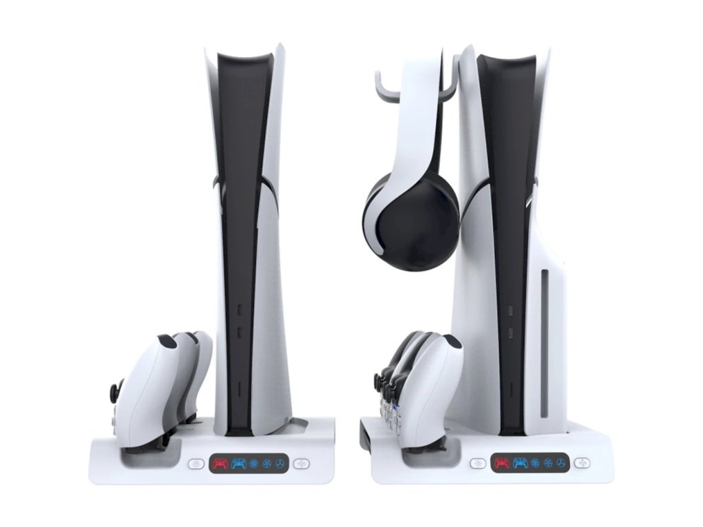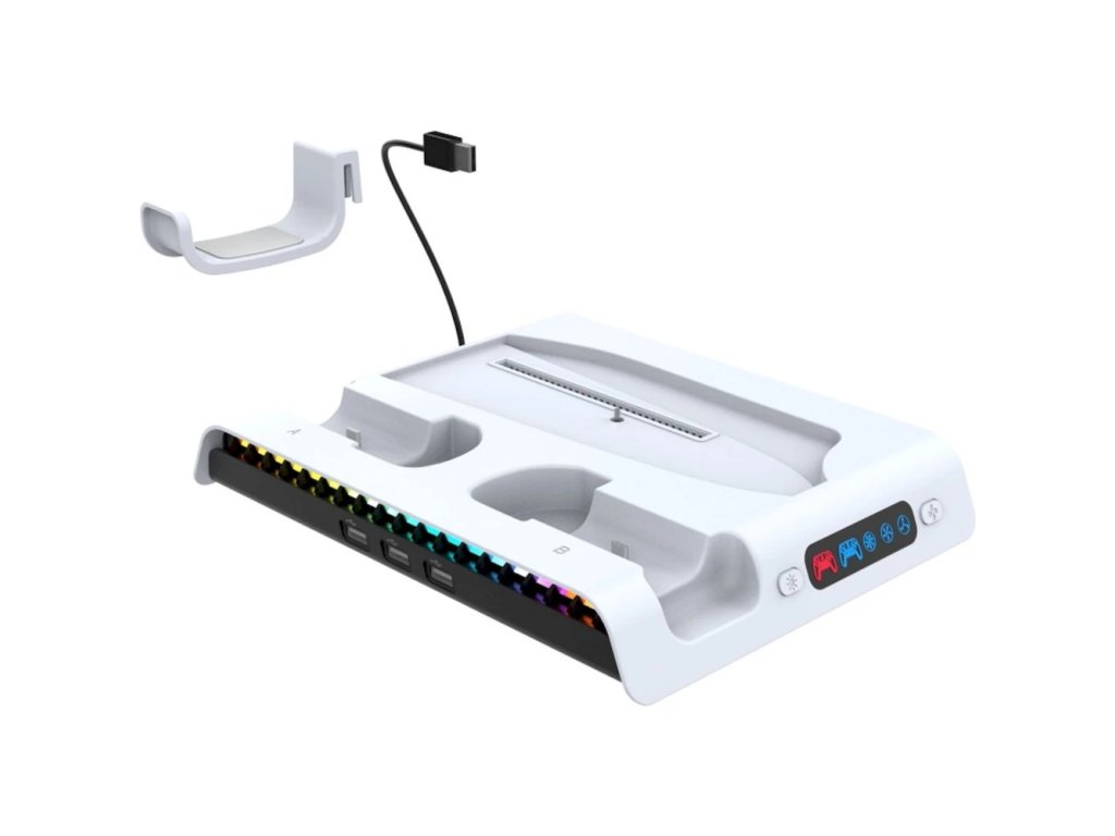 Nabíjecí stanice iPega pro Playstation 5 Slim (CD/Digital) s RGB podsvícením, aktivním chladícím systémem, držákem pro sluchátka a trojicí USB-A portů. Dokáže nabíjet dva DualSense ovladače a díky barevným ikonkám zobrazuje jejich aktuální stav baterie. Nabíjecí stanice pro PlayStation 5 Slim s aktivním chlazením, RGB podsvícením, držákem na sluchátka, USB porty a nabíjecími kolébkami pro dva ovladače DualSense. Díky minimalistickému designu, ladící s herní konzolí, doplní váš herní koutek a zajistí vám stálé místo pro odkládání herních ovladačů. Stanice je vybavena stylovým RGB podsvícením, ve kterém se kombinuje 9 barevných odstínů. Podsvícení lze samozřejmě vypnout pomocí tlačítka na dokovací stanici. Mezi další vychytávky patří aktivní chlazení, prostřednictvím zabudovaného ventilátoru. To oceníte zejména při několikahodinovém hraní, kdy se konzole začíná značně zahřívat. Dokovací stanice má také trojici USB-C portů pro připojení dalších doplňků, držák na sluchátka a samozřejmě dvě nabíjecí kolébky pro dva DualSense ovladače. *Nabíjecí stanice iPega pro PlayStation 5 Slim/PlayStation 5 Slim Digital *Aktivní chlazení, díky zabudovaným ventilátorům *RGB podsvícení (9 barev) – lze vypnout pomocí tlačítka *Nabíjí dva DualSense ovladače *Držák na sluchátka *3x USB-A *Barevné ikonky ovladačů, díky kterým poznáte stav baterieDodatočné parametre