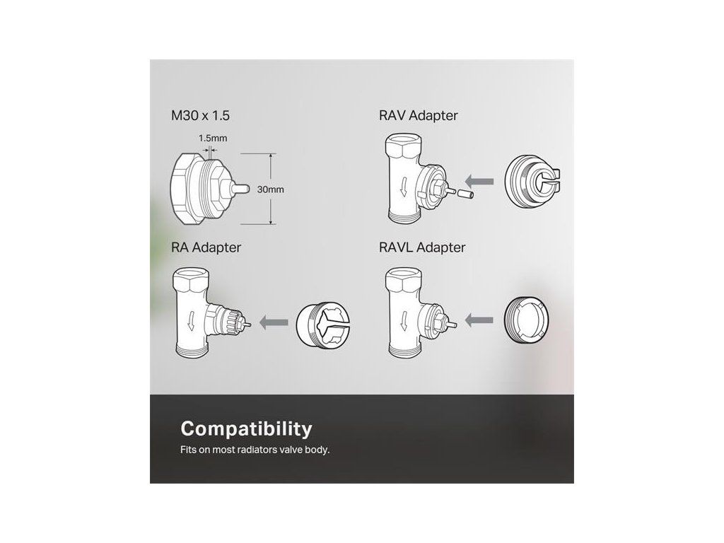 Univerzálna kompatibilita - hodí sa na väčšinu závitov radiátorových ventilov (M30 × 1,5) a balenie obsahuje tri adaptéry (RA, RAV a RAVL) pre ešte jednoduchšiu montáž.