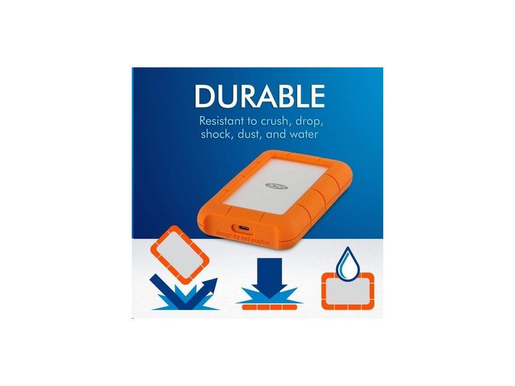 LaCie Rugged odoláva pádom, rozdrveniu, dažďu a neoprávnenému prístupu. Je dostatočne odolný na extrémne podmienky - od náhlej búrky až po rozdrvenie kufrov v nákladnom priestore lietadla.