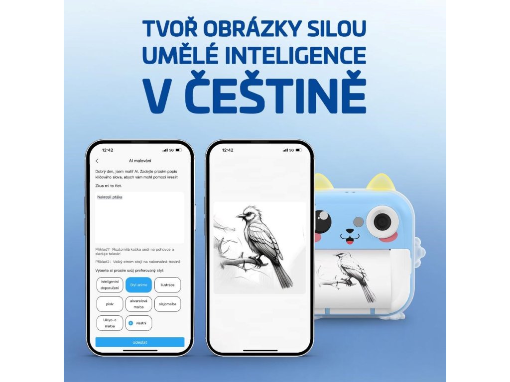 Foťák je prepojený s chytrou aplikáciou v češtine, takže jej ovládanie zvládnu aj menšie deti. Aplikácia toho ale vie oveľa viac. Okrem tlače fotiek, poznámok alebo samolepiek priamo z telefónu zvláda aj skenovanie ručne písaných zápiskov, preklady textov z obrázkov, AI vyfarbovanie, tvorbu obrázkov pomocou umelej inteligencie alebo prevod fotografií do animovaného štýlu. Stačí pár kliknutí a deti si samy vytvoria obrázky presne podľa svojej predstavy.