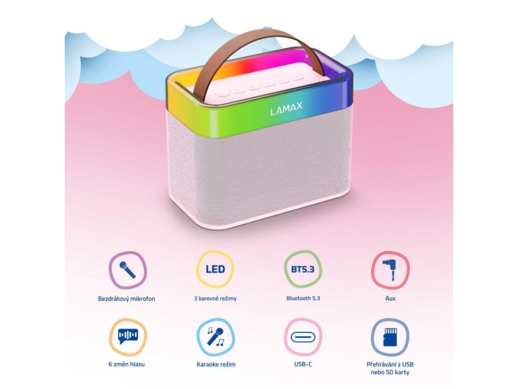 LAMAX KaraokeKid1 je ako cukrík a deti si ho zamilujú na prvý pohľad. Pristane mu ružová aj modrá a rovnako slušivým detským dizajnom sa pýši aj karaoke mikrofón. Atmosféru skutočnej show ešte podčiarkuje farebné LED podsvietenie. Vystúpenie môže dieťa rozbehnúť kdekoľvek, pretože reprák je ľahko prenosný a jeho mušiu váhu unesú aj tí najmenší umelci. Slušnú má tiež výdrž, prehráva až 8 hodín a batéria mikrofónu zvládne až 6-hodinové vystúpenie.