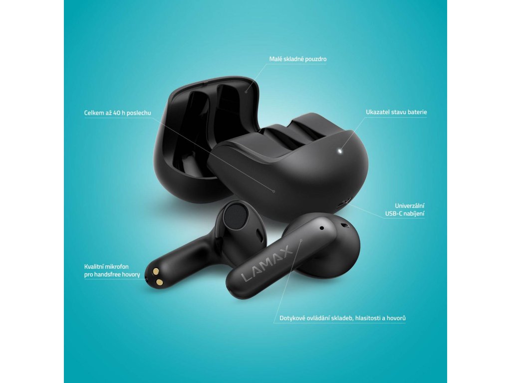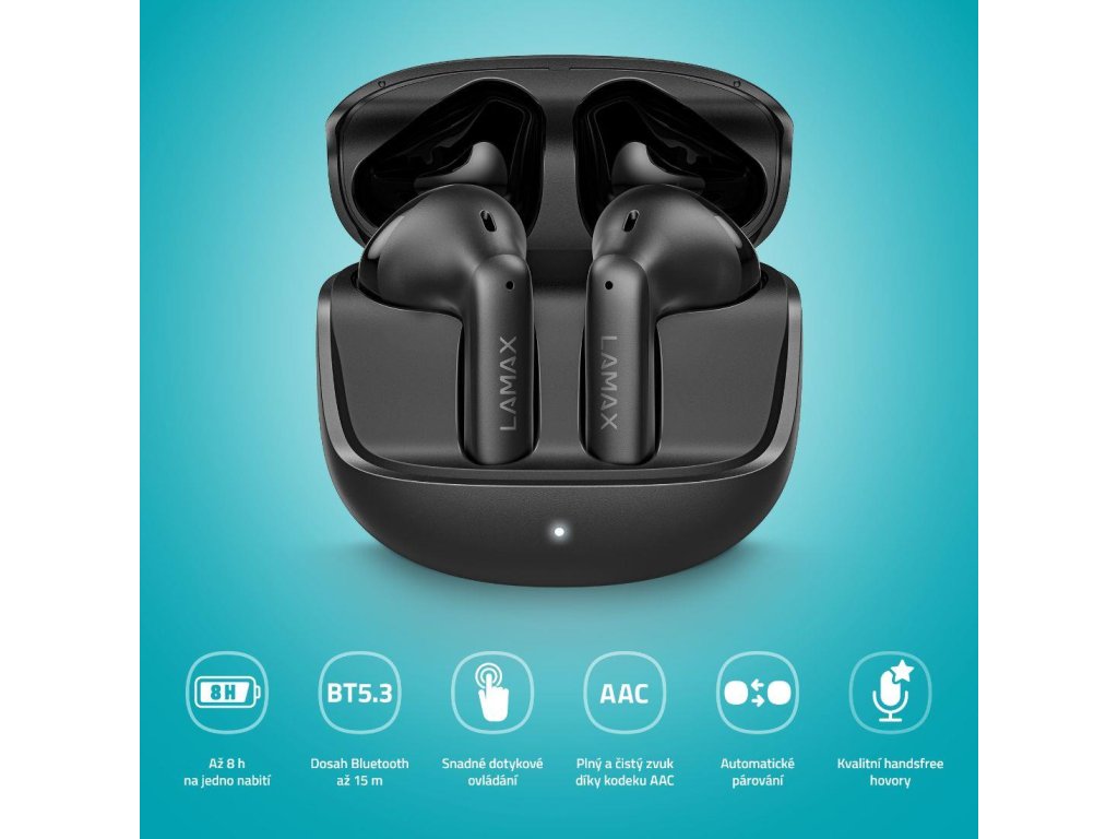 Nebuďte bez hudby ani minútuBezdrôtové slúchadlá LAMAX Tones1 sú dokonalé slúchadlá LAMAX! S rýchlym pripojením Bluetooth 5.3 a dosahom 15 metrov si na jedno nabitie vystačíte až na 8 hodín bezproblémového počúvania. Potrebujete viac? V puzdre na vás čaká ďalších 32 hodín. Vychutnajte si vynikajúci zvuk kdekoľvek a kedykoľvek, či už pracujete alebo sa hráte. Vďaka kvalitnému mikrofónu a jednoduchému ovládaniu stačí stlačiť tlačidlo prehrávania a vyraziť!
