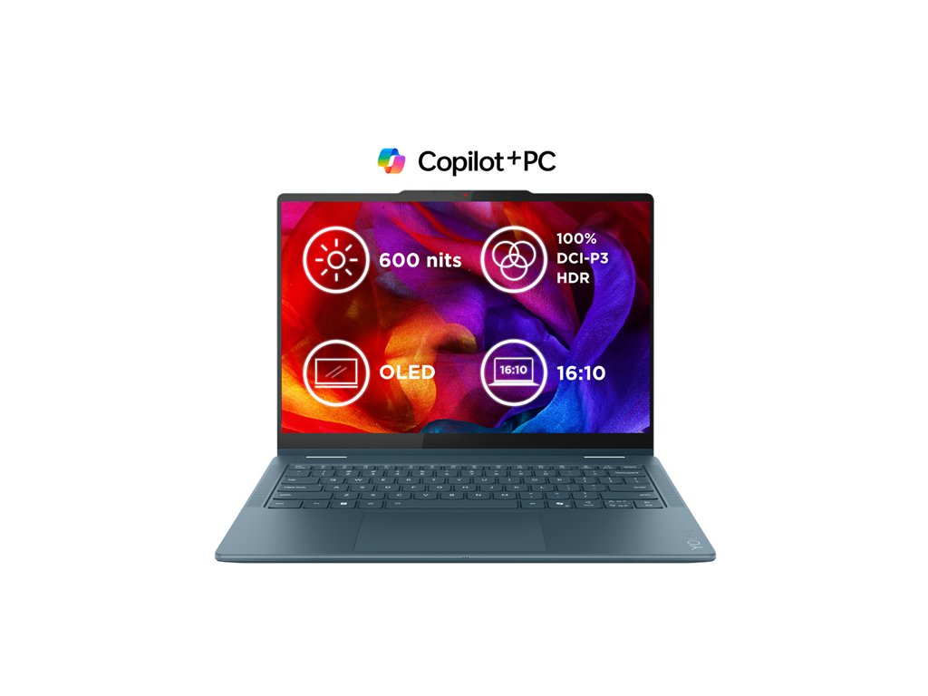Part number 83JR003HCK Procesor AMD Ryzen™ AI 5 340 (6C / 12T, 2.0 / 4.8GHz, 6MB L2 / 16MB L3) NPU Integrated AMD Ryzen™ AI, up to 50 TOPS Pamät 1 x 16GB Soldered LPDDR5x-7500 (24GB max, volné sloty: 0) Pevný disk 1TB SSD M.2 2242 PCIe 4.0x4 NVMe (volné sloty: 1) Displej 14" WUXGA (1920x1200) OLED 600nits (peak) / 400nits (typical) Glossy / Anti-fingerprint, 100% DCI-P3, 60Hz, Dolby Vision®, TÜV Low Blue Light, DisplayHDR™ True Black 500, Glass, Touch Grafická karta Integrated AMD Radeon™ 840M Graphics Komunikácia Ethernet: nie WLAN + Bluetooth: Wi-Fi® 7, 802.11be 2x2 + BT5.4 WWAN: nie je možný Rozhranie 1x USB-A (USB 5Gbps / USB 3.2 Gen 1), Always On 1x USB-C® (USB 10Gbps / USB 3.2 Gen 2), with USB PD 3.1 and DisplayPort™ 2.1 UHBR10 1x USB-C® (USB 10Gbps / USB 3.2 Gen 2), with USB PD 3.1 and DisplayPort™ 1.4a 1x HDMI® 2.1, up to 4K/60Hz 1x Headphone / microphone combo jack (3.5mm) 1x microSD card reader Bezpecnost Smart Card Reader: nie Security Chip: Microsoft® Pluton TPM 2.0 Enabled Fingerprint Reader: nie Operacný systém Windows 11 Home Batéria Integrated 70Wh Dalšie špecifikácie Kamera: 5.0MP + IR with Privacy Shutter Pero: Lenovo® Yoga® Pen Polohovacie zariadenie Podsvietená klávesnica: áno Numerická klávesnica: nie Touchpad: ano Oznacenie klávesnice: slovensko - ceské Farba povrchu: Tidal Teal/ Modro-zelena Hmotnost a rozmery od 1.38 kg 317 x 228 x 15.45 mm Záruka 3 roky Premium CareDodatočné parametre