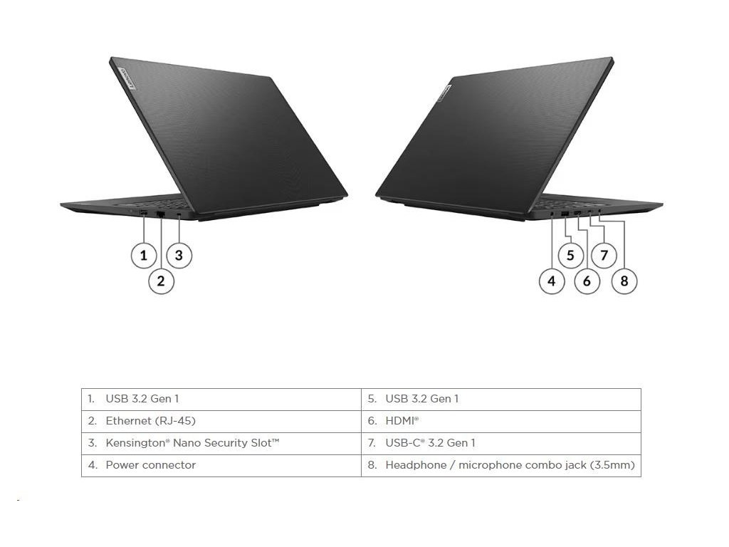 | Standartné porty | 2x USB 3.2 Gen 1 1x USB-C 3.2 Gen 1 (support data transfer, Power Delivery (20V only) and DisplayPort™ 1.2) 1x HDMI 1.4b 1x Headphone / microphone combo jack (3.5mm) 1x Ethernet (RJ-45) 1x Power connector |