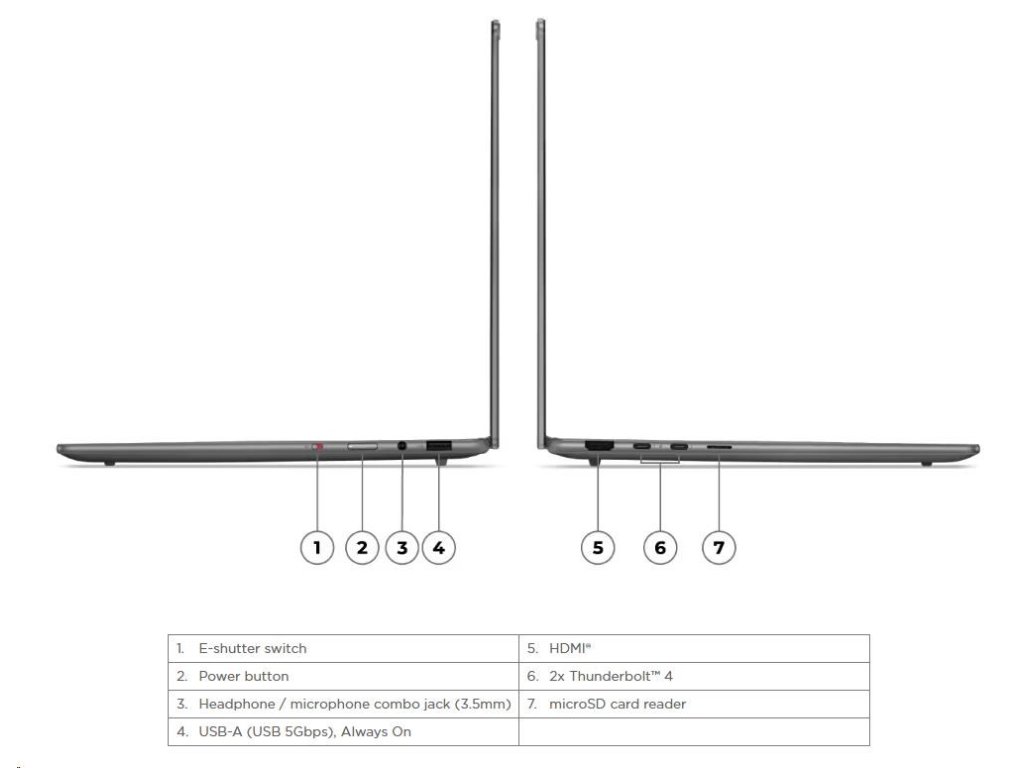 | Standartné porty | 1x USB-A (USB 5Gbps / USB 3.2 Gen 1), Always On 2x USB-C (Thunderbolt™ 4 / USB4 40Gbps), with USB PD 3.0 and DisplayPort™ 2.1 1x HDMI 2.1, up to 4K/60Hz 1x Headphone / microphone combo jack (3.5mm) 1x microSD card reader |