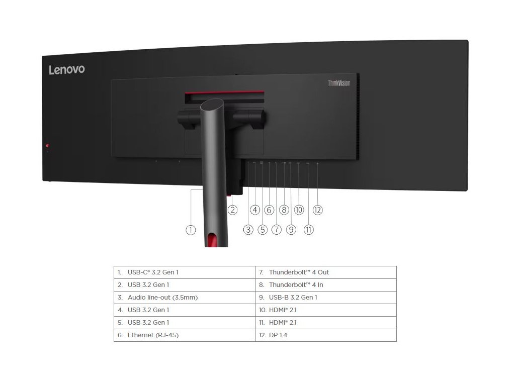 *3800R *Modular Camera Support *Tiny Support *Picture In Picture (PIP) / Picture By Picture (PBP) Support *KVM Switch *Natural Low Blue Light *Lenovo® ThinkColour (Lenovo Display Control Center) Support *Smart Power *True Split Typ obrazovky: In-Plane Switching Podsvícení: WLED Úhlopříčka [palce]: 49'' Rozlišení: 5120 x 1440 Rozteč bodu [mm]: 0.234 Obnovovací frekvence [Hz]: 60 Hz Poměr stran: 32:9 Povrch displeje: Anti-glare Jas [cd/m2]: 350 Kontrast: 2000:1 Odezva [ms]: 4ms (Extreme mode) / 6ms (Normal mode) Pozorovací úhly (Horizontál/Vertikál): 178° / 178° Počet barev: 1.07 Billion Reproduktory: 5W x 2 Konektory: *USB Port: 4x USB 3.2 Gen 1, 1x USB-C® 3.2 Gen 1, 1x USB-B 3.2 Gen 1, 1x Thunderbolt™ 4 Out, 1x Thunderbolt 4 In *Video Connector: 2x HDMI® 2.1, 1x DP 1.4, 1x Thunderbolt™ 4 in, 1x Thunderbolt 4 out *Network Connectivity: 1x RJ45, Ethernet (10M/100M/1000M) Napájení: Integrated Spotřeba [W]: 58 W Montáž na zeď: Supports VESA mount 100 x 100 mm / 200 x 100 mm Naklápění monitoru: Tilt, Swivel, Height Adjust Stand Barva: Raven Black Rozměry (se stojanem, ŠxVxH mm): 1215.1 x 576.3 x 253.9 mm Hmotnost [kg]: 15.8 kg Video Kabel: USB-A to USB-B cable, Thunderbolt™ cable TCO Certified: Ano Záruka: 36 měs. https://psref.lenovo.com/Detail/ThinkVision_P49w_30?M=63DBRAT1EUDodatočné parametre