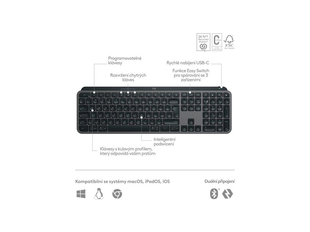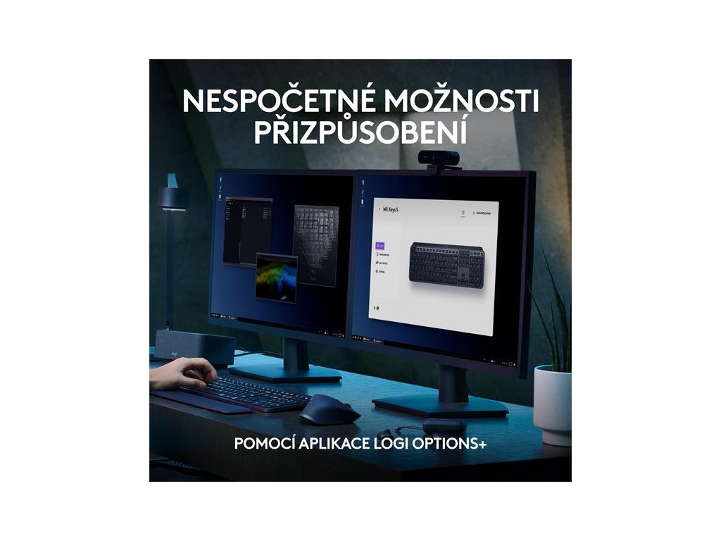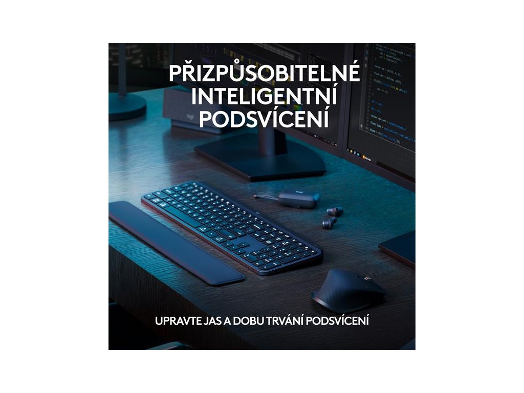 Bezdrátová klávesnice Logitech MX Keys S – nízkoprofilová klávesnice úplné velikosti, která nabízí plynulý a přesný průběh psaní a přizpůsobitelné, časově úsporné chytré akce, které automatizují nejvíce opakované úkoly jedním stisknutím klávesy. Podsvícená klávesnice disponuje inteligentním podsvícením, které se rozsvítí při přiblížení vašich rukou a automaticky se přizpůsobí denní době.Pohodlně vytvářejte a přizpůsobujte chytré akce, upravte jas a dobu podsvícení, zkontrolujte životnost baterie, přiřaďte specifické profily pro jednotlivé aplikace pomocí aplikace Logi Options+.