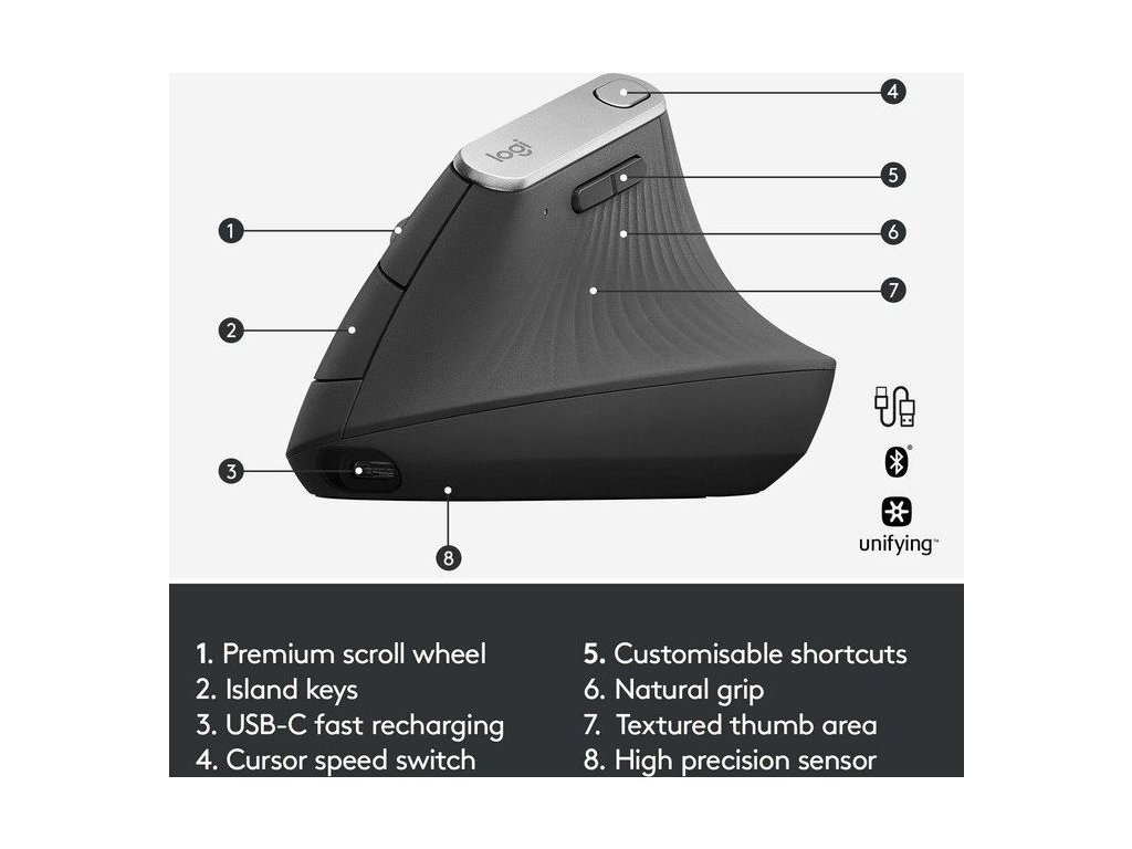 Myš MX Vertical je tvarovaná pre ľudskú ruku a jemná na dotyk. Jej jedinečný tvar je vďaka svojmu prevedeniu vhodný pre ruky rôznych tvarov i veľkostí, a plastický, pogumovaný povrch zaistí spoľahlivý a prirodzený úchop.