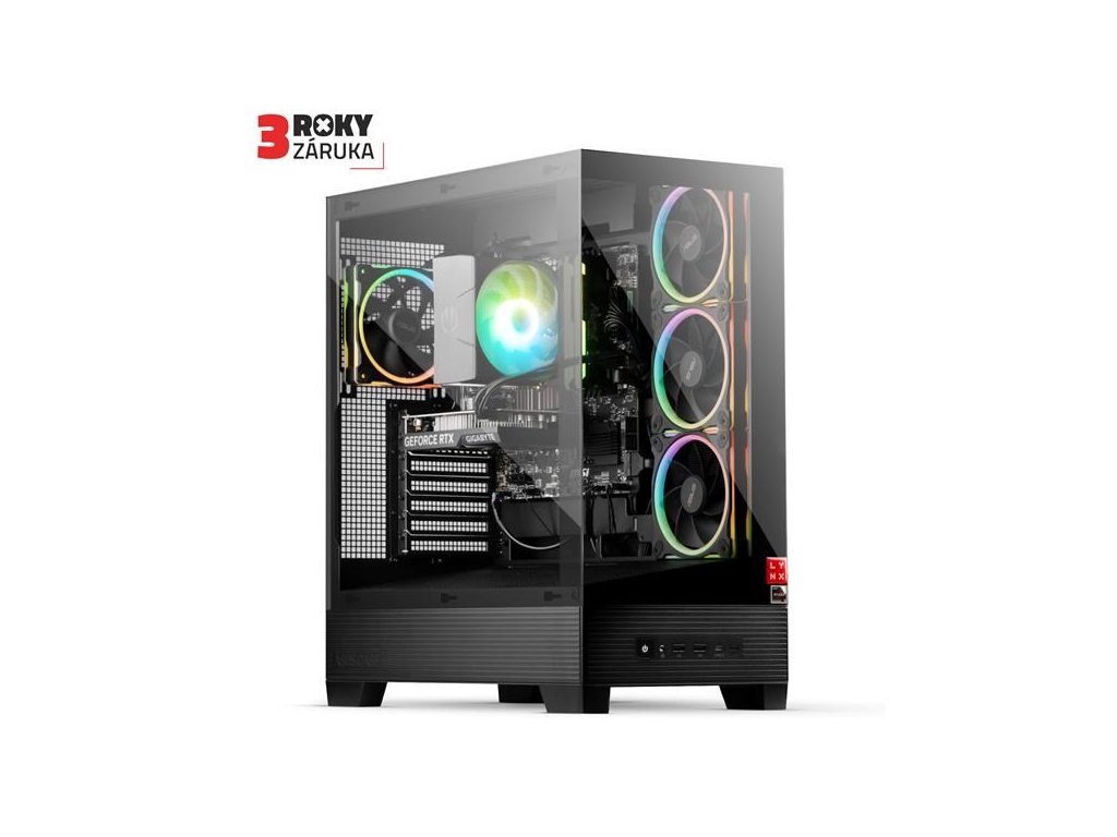 Stylová skříň s prosklenou bočnicí a čtyřmi ARGB ventilátory .