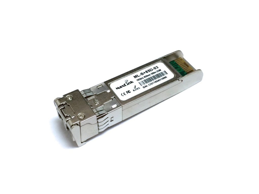 MaxLink 10G SFP+ optický modul, MM, 850nm, 300m, 2x LC konektor, DDM ML-S+85D-03 je multimode 10G SFP+ modul s vlnovou délkou 850nm a dvěma LC konektory pro spojení až na vzdálenost 300m. Modul je ''cisco compatibile'' a je kompatibilní téměř se všemi aktivními prvky. LC konektory v SFP modulu mají broušení typu UPC. Formát: SFP+ Pro typ kabelu: Multi Mode Přenosová rychlost: 10 Gbps Vlnová délka - Tx/Rx [nm]: 850 Dosah [km]: 0,3 Typ přenosu: 2-vláknový Optické konektory: 2x LCDodatočné parametre