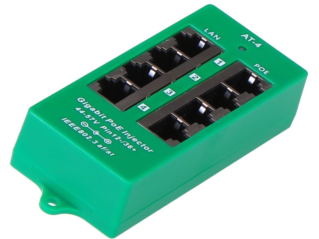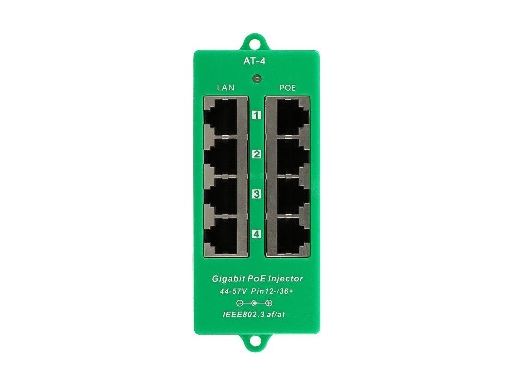 MaxLink POE-PAN4-GB-AF/A Gigabitový aktivní PoE injektor určený pro napájení až čtyř zařízení, jako jsou IP kamery, VoIP telefony nebo další síťová zařízení s podporou standardů 802.3af/at. Poskytuje spolehlivé napájení i přenos dat po ethernetovém kabelu a je vhodný pro profesionální instalace s vyššími nároky na výkon. Konektory a rozhraní *Rychlost ethernetu [Mb/s]: 10 / 100 / 1000 *Gigabit LAN: Ano Napájení *Napájení na pinech: 1,2 (-), 3,6 (+) *Výstupní výkon na port [W]: 30 *Podporované PoE-Out standardy: 802.3af, 802.3at *Počet PoE Out portů: 4 *Výstupní napětí [V]: 44–57 V DC Fyzické charakteristiky *Stínění: Ano *LED indikace: Ano *Provozní teplota [°C]: 0 až 50 *Výška [mm]: 25 *Šířka [mm]: 45 *Hloubka [mm]: 115Dodatočné parametre