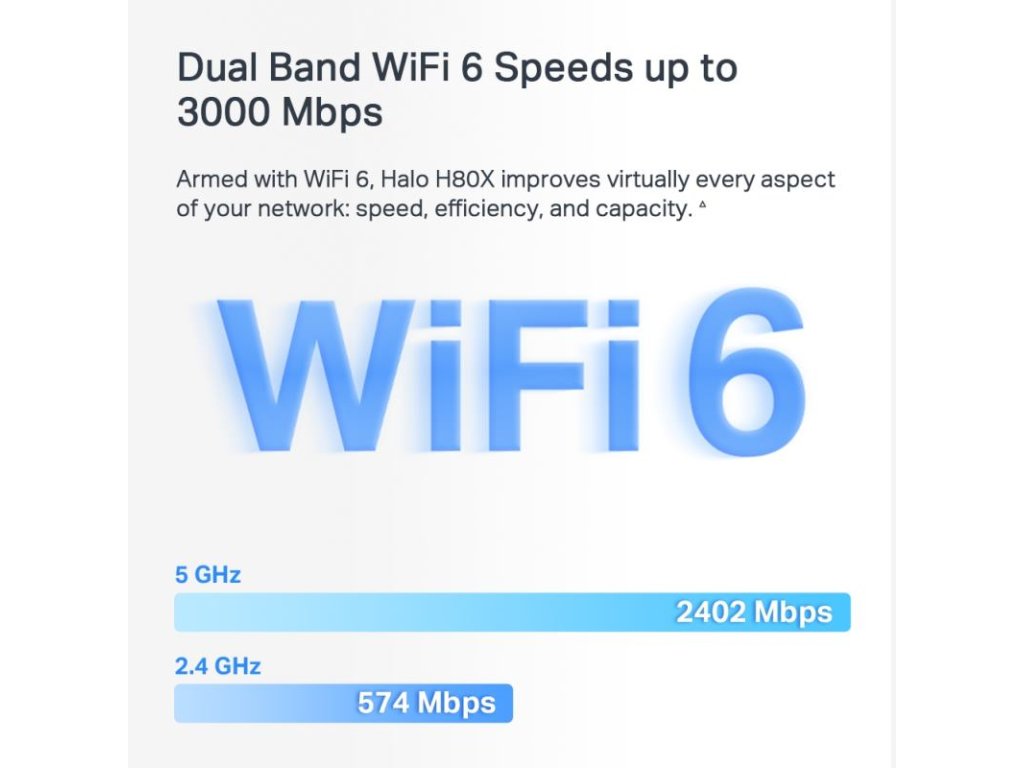 Dual Band WiFi 6 rýchlosť až 3000 Mbps - 2402 Mbps na 5 GHz a 574 Mbps na 2,4 GHz.