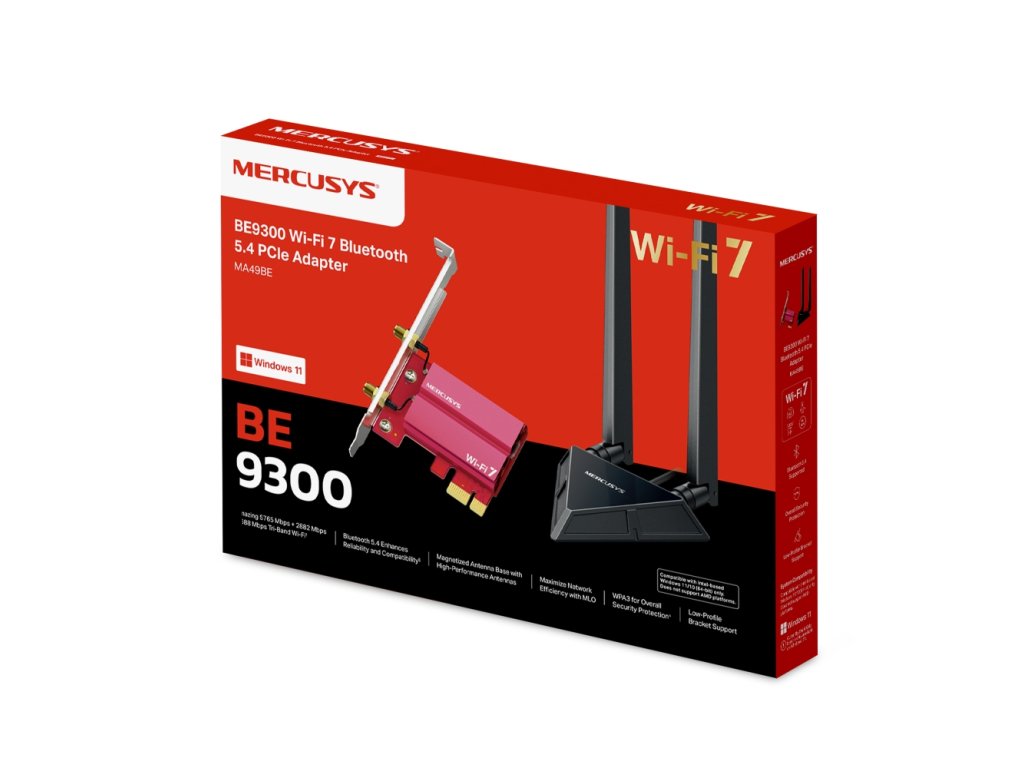 MA49BE BE9300 Wi-Fi 7 Bluetooth 5.4 PCIe adaptér Vysoce výkonný síťový adaptér pro stolní počítače, který přináší revoluční technologii Wi-Fi 7 a nejnovější standard Bluetooth 5.4 pro bleskové připojení a minimální latenci. Bezdrátová síť *Standard: Wi-Fi 7 (IEEE 802.11be/ax/ac/n/a/b/g) *Frekvence: 6 GHz, 5 GHz, 2,4 GHz *Zabezpečení: WPA, WPA2, WPA3-Personal *Rychlost Wi-Fi: 6 GHz: až 5760 Mb/s, 5 GHz: až 2880 Mb/s, 2,4 GHz: až 574 Mb/s Výkon a kapacita *Šířka kanálu: až 320 MHz (6 GHz) *Technologie: MLO (Multi-Link Operation), 4K-QAM, Multi-RU, MU-MIMO *Bluetooth: Verze 5.4 (vyšší rychlost, stabilita a nižší latence pro periferie) *Vlastnosti: Výrazné snížení latence v režimu Wi-Fi 7 pro náročné hraní a VR Porty a hardware *Rozhraní: PCI Express x1 *Antény: 2× externí vysokoziskové antény s magnetickou základnou *LED: Indikace stavu napájení a aktivity *Chlazení: Specializovaný pasivní chladič pro optimální odvod tepla Režimy provozu *Režim stanice (Příjem Wi-Fi signálu) *Bluetooth adaptér pro připojení sluchátek, klávesnic a dalších zařízení Zabezpečení *WPA3: Nejnovější úroveň zabezpečení sítě pro ochranu hesel a dat *Šifrování: 64/128 bitové WEP, WPA/WAP2/WPA3, WPA-PSK/WPA2-PSK/WPA3-SAE Software a správa *Podporované systémy: Pouze Windows 11 (64-bit) – vyžadováno pro plnou podporu Wi-Fi 7 *Instalace: Ovladače na přiloženém médiu nebo ke stažení na webu výrobce *Bluetooth konfigurace: Standardní správa v rámci systému Windows Fyzické parametry *Provedení: PCIe karta s nízkoprofilovou i standardní záslepkou *Anténní základna: Magnetická s prodlužovacím kabelem pro optimální umístění Obsah balení *MA49BE Kit: 1× PCIe adaptér MA49BE, 1× magnetická anténní základna s kabelem, 2× anténa, 1× Low-Profile záslepka, 1× Bluetooth Header kabel, stručný návod Provozní podmínky *Provozní teplota: 0 °C až 40 °C *Vlhkost: 10 % až 90 % RH (nekondenzující) Odkaz na web výrobce: https://www.mercusys.com/cz/product/details/ma49be/Dodatočné parametre