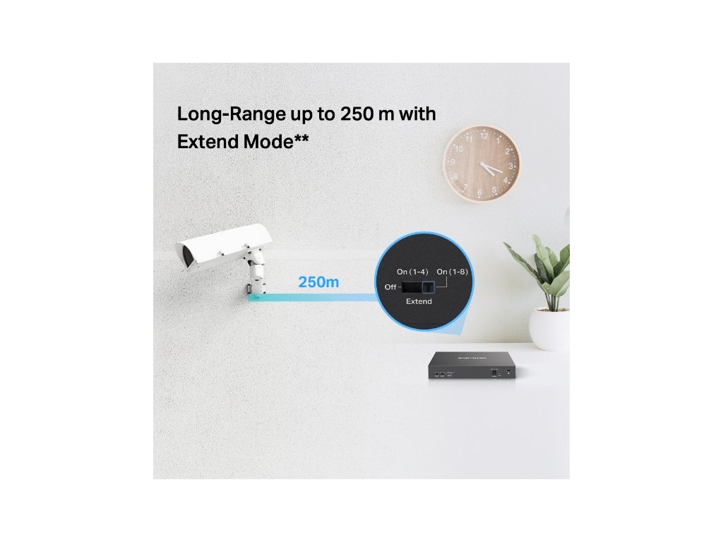 Switch, jednoduchá inštalácia, veľmi kompaktný tvar, moderný vzhľad. Podporuje Auto-Negotiation, Auto-MDI/MDIX. Rozhranie: 10x 10/100 Mbps RJ45, PoE+ na portoch 1 - 8, celkový PoE rozpočet 65 W.