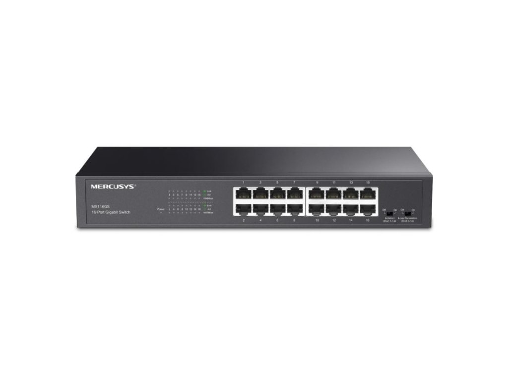 MERCUSYS MS116GS, 16-Port 10/100/1000 Mbps Desktop Switch - 16-portový gigabitový stolný/rackmount prepínač, 6× 10/100/1000 Mbps Auto-Negotiation RJ45 port s podporou Auto-MDI/MDIX, Režim izolácie umožňuje oddelenie klientskej prevádzky jedným kliknutím pre vyššiu bezpečnosť a výkon, Monitorujte a riešte problémy súvisiace so slučkami vo vašej sieťovej štruktúre, aby ste zabránili narušeniam spôsobeným slučkami, Odolné kovové puzdro