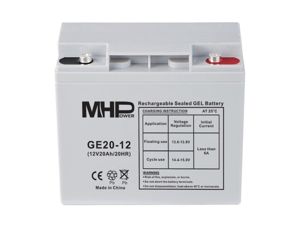 MHPower Gelový akumulátor deep cycle VRLA GEL s pokročilou technologií vazby elektrolytu na křemičitý gel přináší řadu nesporných výhod oproti klasickým akumulátorům s tekutým elektrolytem. Těmi nejvýznamnějšími je absolutní bezúdržbovost po celou dobu životnosti, nízká míra samovybíjení, teplotní stabilita, vysoká odolnost hlubokému vybíjení a následné rychlé „zotavení“, snížený vliv vibrací a mechanického poškození gelem fixovaných desek, nevrstvení elektrolytu se všemi negativy a nízká koroze elektrod a sulfatace. Gelové baterie řady MHPower GE jsou vyráběny se speciálními separátory a silikagelem imobilizujícím elektrolyt uvnitř baterie. Osvědčená technologie silikagelu může zlepšit životnost baterie a výkon v širším teplotním rozsahu. Životnost cyklu hlubokého vybití je zvýšena o 50 % ve srovnání s bateriemi řady MS. Životnost Cyklická životnost: 500 cyklů při 80% vybití, 800 cyklů při 50% vybití a 1600 cyklů při 30% vybití. Životnost 12 let v provozu trvalého (float) dobíjení při 20 °C. Baterie je vhodná jak pro cyklický provoz (vybití-nabití) tak pro trvalé dobíjení s malou mírou vybíjení. Výhody gelové baterie: 1. Gelová baterie používá gelový elektrolyt, který může zabránit tepelnému úniku baterie se silnou schopností rozptylu tepla, 2. Gelová baterie používá speciální mřížku ze slitiny vápníku a olova a cínu, odolnější vůči korozi, 3. Gelová baterie používá vysoce pevný separátor, aby se zabránilo zkratu, 4. Gelová baterie je vybavena filtračním zařízením proti výbuchu kyselé mlhy, bezpečnější a spolehlivější. 5. O 50 % delší životnost než u řady MS (AGM). 6. Vysoce čistá slitina olova a cínu, snižuje rychlost samovybíjení baterie a zvyšuje životnost baterie. 7. Pouzdro na baterie ABS vyrobené ze surovin LG pro zvýšení životnosti baterie. 8. Technika tepelného těsnění místo lepení pro zvýšení těsnosti a stability baterie. 9. Technika TTP nejen snižuje vnitřní odpor a náklady na materiál, ale také zvyšuje životnost baterie. Gelové akumulátory MHPower jsou vhodné jako náhradní baterie pro elektronické systémy a především pro následující aplikace: - záložní zdroje (UPS) - solární a fotovoltaické systémy - elektronické protipožární systémy (EPS) - elektronické zabezpečovací systémy (EZS) - telekomunikační zařízení - nouzové osvětlení - geofyzikální, meteorologické a medicínské přístroje a vybavení - zálohování oběhových čerpadel a kotlů Gelové akumulátory MHPower nedoporučujeme používat jako startovací baterie ! Nabíjecí a vybíjecí proudy: 1/ Maximální nabíjecí proud: 0,1C až 0,25C (C=hodnota Ah jmenovité kapacity baterie) 2/ Doporučený vybíjecí proud pro zachování dlouhé životnosti: max. 0,3C (C=hodnota Ah jmenovité kapacity baterie) Fyzické charakteristiky Počet článků: 6 Hmotnost [kg]: 5,3 Šířka [mm]: 181 Výška [mm]: 167 Výška s konektory [mm]: 167 Hloubka [mm]: 77Dodatočné parametre