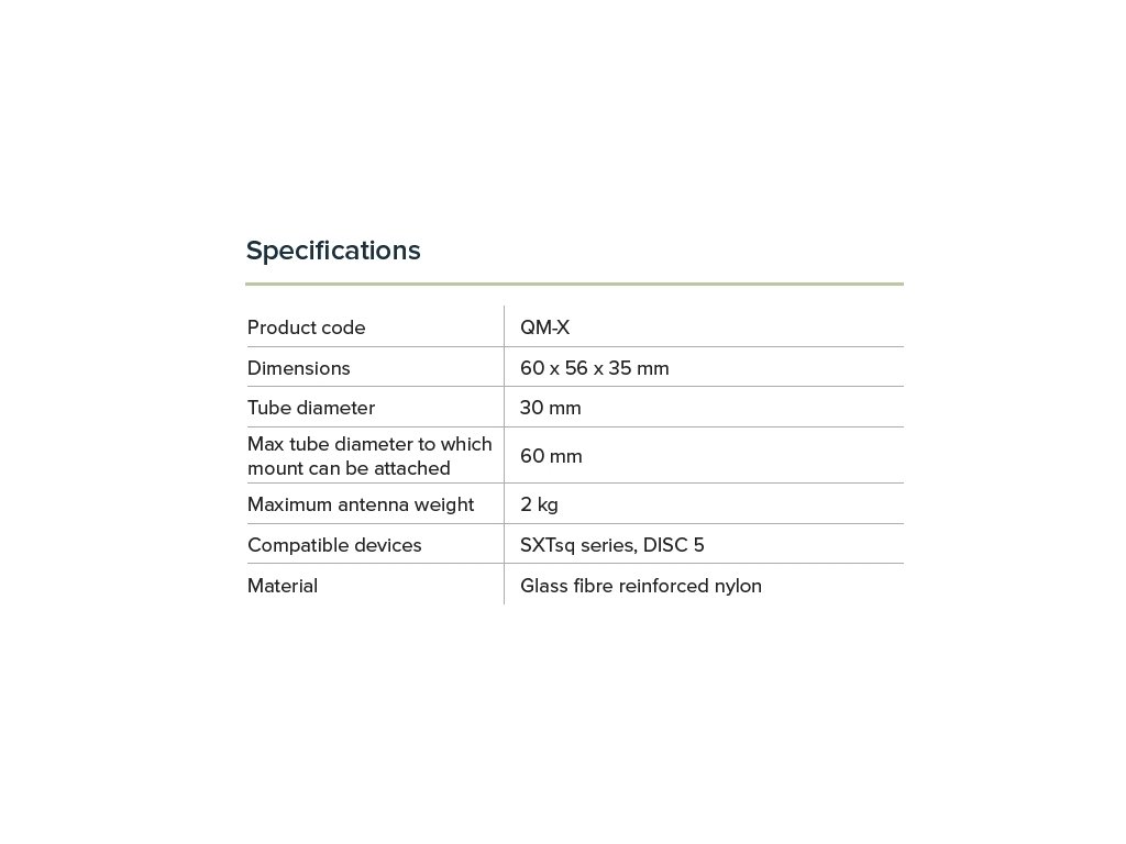 Držák na stožár či konzoli 'quickMOUNT-X' umožňuje snadnou instalaci outdoor jednotek modelové řady ''square'' či ''disc''. QM-X umožňuje snadnou instalaci prvků do hmotnosti 2kg na stožár (30-60mm) a jejich elevaci ve vertikální i horizontální rovině. Podrobné technické specifikace: Product code: QM-X Dimensions: 60 x 56 x 35 mm Tube diameter: 30 mm Max tube diameter to which mount can be attached: 60 mm Maximum antenna weight: 2 kg Compatible devices: SXTsq series, DISC 5 Material: Glass fibre reinforced nylonDodatočné parametre