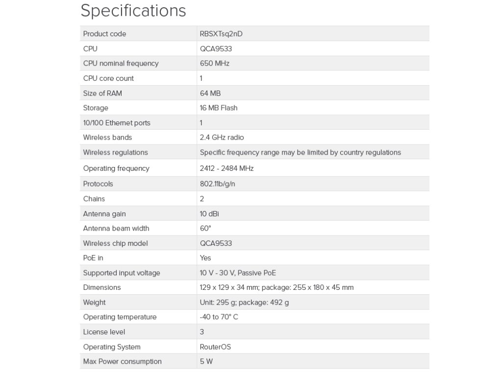 Systémové řešení platforem firmy MikroTik pro poskytovatele bezdrátového připojení k síti Internet. Klientská jednotka vyznačující se extra příznivou cenou, nenápadným designem s kompaktními rozměry (13x13cm) a vysokou štíhlostí. Outdoor jednotka s integrovaným 2,4GHz modulem 802.11b/g/n (MIMO2x2) a včetně systému RouterOS Mikrotik V6 L3. Integrováno ve vodotěsném, UV odolném boxu s integrovanou duální 2,4GHz anténou se ziskem 10dBi a výstupem až 20dBm. Bezdrátový modul je vybaven přepěťovou ochranou 10 kV. Set je vhodný pro připojení klientů až na vzdálenost 1 km. Součástí dodávky je napájecí zdroj 24V 0,3A včetně PoE. - předinstalovaný a aktivovaný operační systém RouterOS Level 3 (podpora od verze v4.16) - v nastavení podpora pro nasazení v MIMO 802.11n i 802.11b/g/n standardu - procesor QCA9533 - integrovaný zemnící člen (10kV) Technické specifikace: Product code: RBSXTsq2nD CPU: QCA9533 CPU: nominal frequency 650 MHz CPU core count: 1 Size of RAM: 64 MB Storage :16 MB Flash 10/100 Ethernet ports: 1 Wireless bands: 2.4 GHz radio Wireless regulations: Specific frequency range may be limited by country regulations Operating frequency: 2412 - 2484 MHz Protocols: 802.11b/g/n Chains: 2 Antenna gain: 10 dBi Antenna beam width: 60° Wireless chip model: QCA9533 PoE in: Yes Supported input voltage: 10 V - 30 V, Passive PoE Dimensions: 129 x 129 x 34 mm Weight Unit:: 295 g, package: 492 g License level: 3 Operating System: RouterOS Max Power consumption: 5 W Napájení min (PoE) (V): 10 Napájení max (PoE) (V): 30 Provozní teplota min (°C): -40 Provozní teplota max (°C): 70 Upozornění Výrobce Mikrotik neposkytuje záruku na zařízení poškozená přepětím. Zařízení je třeba adekvátně chránit proti indukovanému elektrostatickému přepětí či přepěťovým špičkám na silovém vedení. Pro venkovní instalace používat výhradně stíněnou kabeláž (FTP/SFTP) a jednotky korektně uzemnit (prostřednictvím integrovaného zemnícího členu či použitím ethernetové přepěťové ochrany).Dodatočné parametre