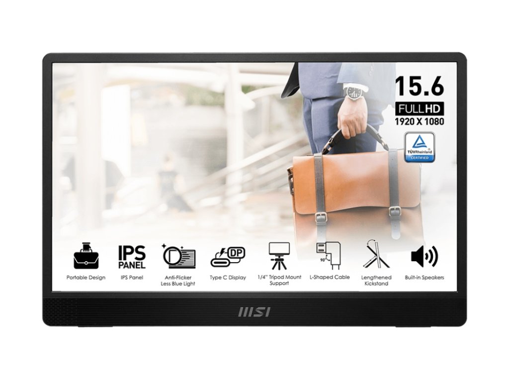 *15,6'' FHD IPS panel – vylepši svůj zážitek ze sledování. *Přenosný design ti umožní vzít displej kamkoliv bez námahy a zátěže, díky ochrannému pouzdru. *Design se závitem na stativ přináší flexibilitu a možnost umístění podle potřeby. *Prodlužovací stojánek podporuje vzpřímenější polohu obrazovky a zajišťuje lepší ergonomický komfort. *Ultra tenký profil s tloušťkou pouze 1,08 cm (0,4”) a extrémně lehká konstrukce s hmotností jen 0,75 kg (1,65 lbs). *Technologie MSI EyesErgo s funkcemi proti blikání, redukcí modrého světla a antireflexní úpravou chrání tvé oči. *Multi vstupy Type-C/mini HDMI™ – umožňují snadné připojení k jakémukoliv zařízení, například smartphonu, kameře, notebooku nebo PC. *Ergonomicky navržený výklopný stojánek s rozsahem 0° ~ 180° umožňuje otočení obrazovky jak na výšku, tak na šířku. *L-tvarované kabely zabraňují ohýbání kabelů a zajišťují pohodlné a nepřerušované používání. *Ergonomický software Display Kit nabízí pohodlné nástroje a správný barevný i obrazový režim pro každodenní práci. *Vestavěné reproduktory ti umožní skvělý zvukový zážitek i na cestách. Typ obrazovky: IPS Úhlopříčka [palce]: 15,6'' Rozlišení: 1920 × 1080 (FHD) Rozteč bodu [mm]: 0,17925 (H) × 0,17925 (V) Obnovovací frekvence [Hz]: 60 Poměr stran: 16:9 Povrch displeje: Anti-glare Jas [cd/m2]: 250 Kontrast: 800:1 Odezva [ms]: 4 (GTG) Počet barev: 16,7 milionu Reproduktory: 2× 1,5 W Konektory: *1× Mini-HDMI™ 2.0b (FHD@60Hz) *2× Type-C (DP 1.2a signál s Alt mode & 15W Power Delivery / Power Input) Napájení: externí USB napájení (Type-C) Ergonomie: náklon 0° ~ 180°, 1/4'' Standard Tripod Socket Barva: Black Rozměry (se stojanem, ŠxVxH mm): 362,26 × 233,84 × 18,8 Hmotnost [kg]: 0,75 / 1,4 (brutto) Záruka: 24 měs.Dodatočné parametre