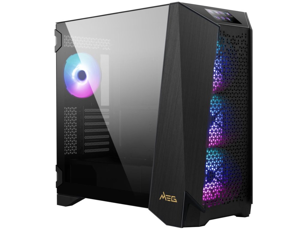 MSI MEG PROSPECT 700RModerní počítačová skříň s modulárním designem, průhlednou bočnicí z temperovaného skla a poloprůhledným čelem s perforací pro optimální proudění vzduchu. Formát Middle Tower nabízí dostatek prostoru pro uložení čtyř disků, základní desky o velikosti E-ATX a až deseti ventilátorů. Předinstalovány jsou čtyři 140 mm ventilátory s ARGB podsvícením. Hornímu panelu dominuje 4,3" dotykový displej s rozlišením 800 × 480 obrazových bodů, který zobrazuje širokou škálu systémových informací a nastavení. Dále se zde nachází dva porty USB 3.0, jeden port USB-C, sluchátkový výstup a audio vstup pro mikrofon. Ve skříni je dostatek prostoru pro chladič CPU do výšky až 185 mm a grafickou kartu o délce až 400 mm. Díky přiloženému držáku lze grafickou kartu instalovat i vertikálně (PCIe kabel není součástí balení). Důmyslné řešení umožňuje pohodlné umístění až 360 mm dlouhého výměníku vodního chlazení na přední, boční nebo vrchní straně. Součástí skříně je také sada magnetických prachových filtrů. Dodávána je bez zdroje.