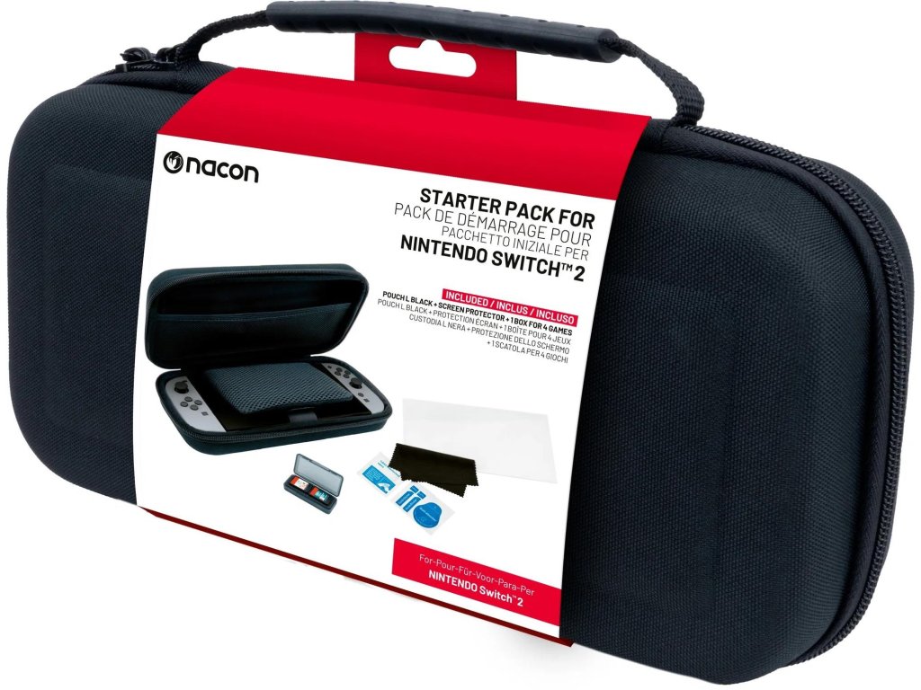 Táto sada príslušenstva od spoločnosti Nacon určená pre hernú konzolu Nintendo Switch 2 obsahuje pevné prepravné puzdro, tvrdené ochranné sklo a praktické puzdro na uloženie ďalších herných kariet.