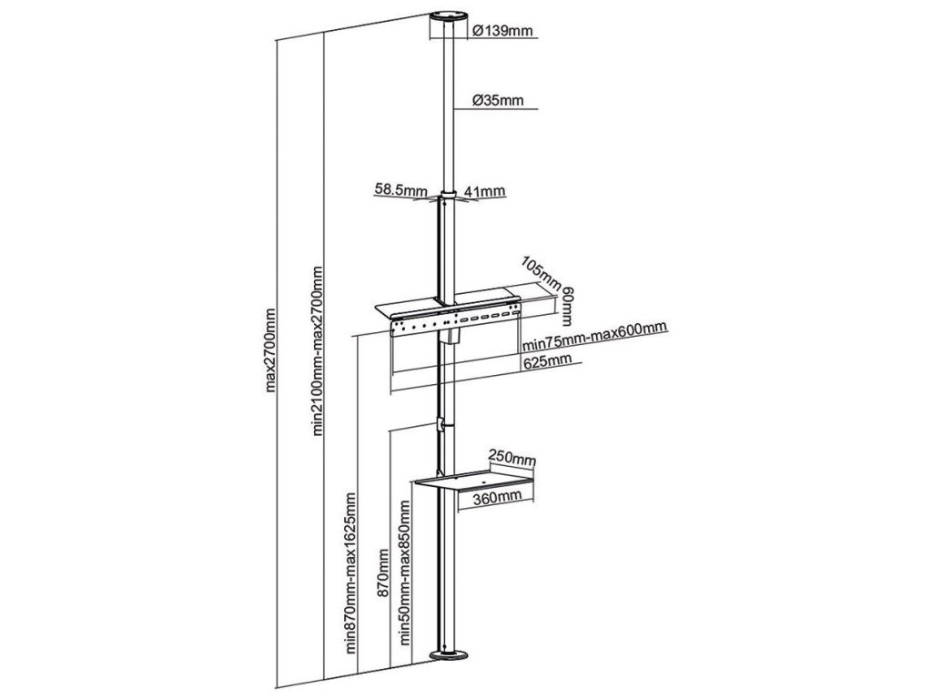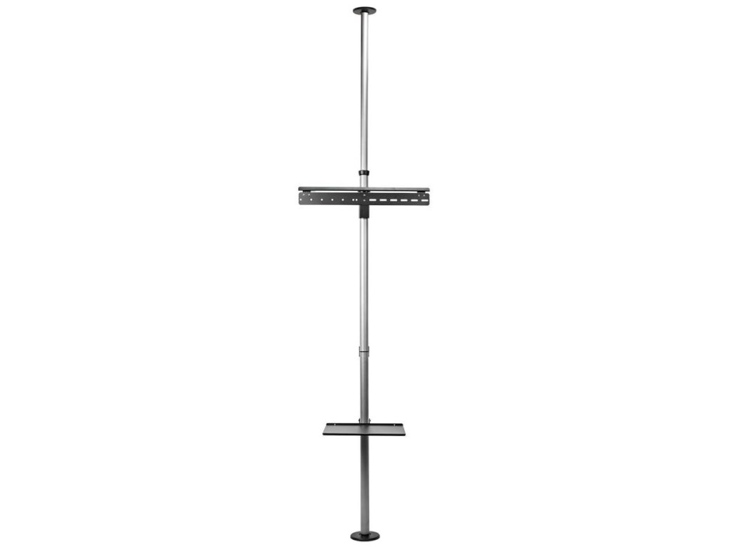 Nedis TVSM5750BKStojan pro montáž televize s úhlopříčkou 37 až 70" určený k upevnění mezi podlahu a strop. Díky teleskopické tyči je možné jej umístit do místrnosti o výšce 210 až 270 cm. Konstrukce stojanu umožňuje snadné nastavení výšky od 87 do 162,5 centrimetrů a otáčení v rozsahu 180°. Zajisté potěší také police pro AV komponenty nebo vestavěný systém správy kabeláže. Maximální hmotnost televizoru je 30 kg, nosnost police pro příslušenství činí 5 kg.