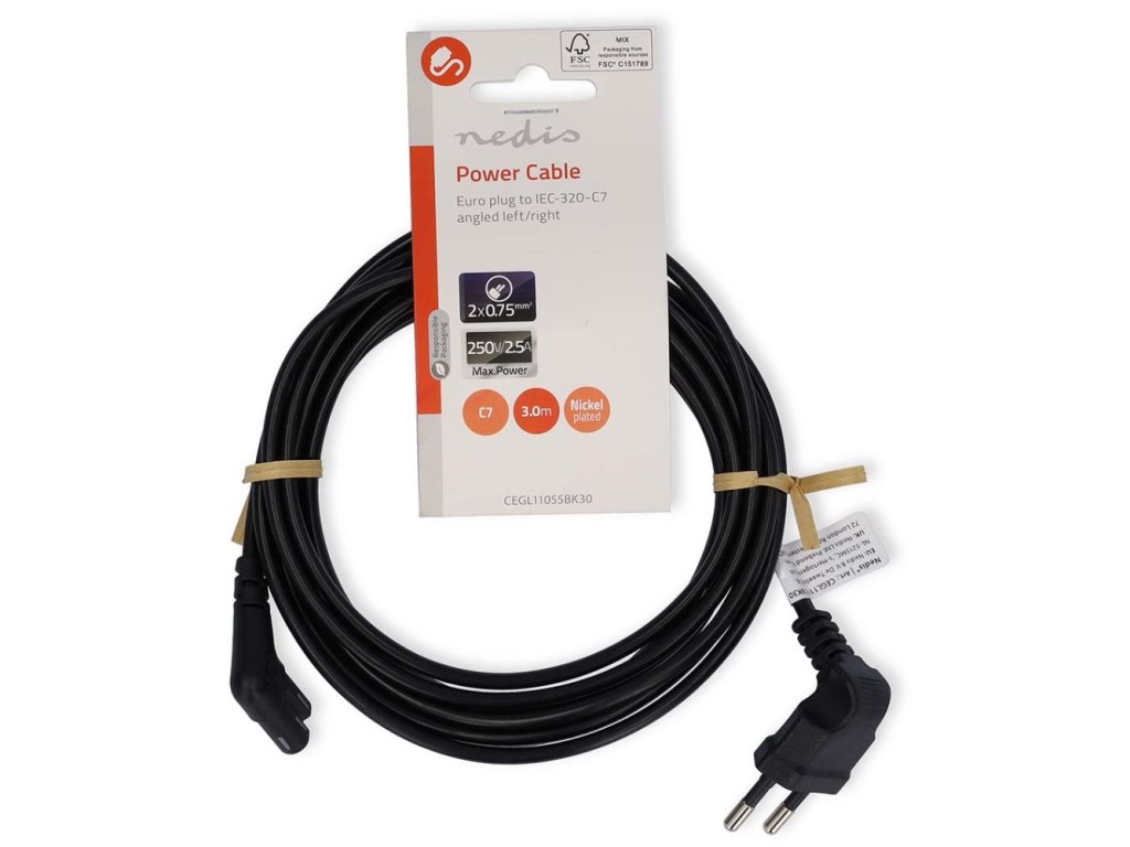 NEDIS napájecí kabel pro adaptéry/ Euro zástrčka - konektor IEC-320-C7/ úhlový-úhlový/ dvoulinka/ černý/ bulk/ 3m CEGL11055BK30