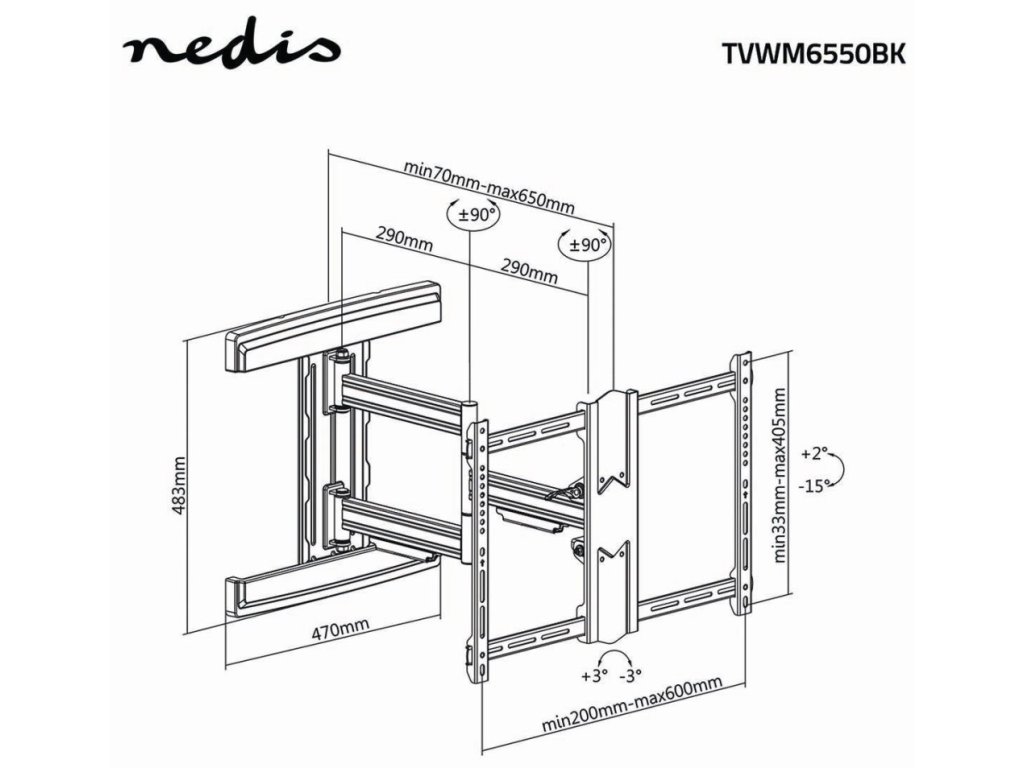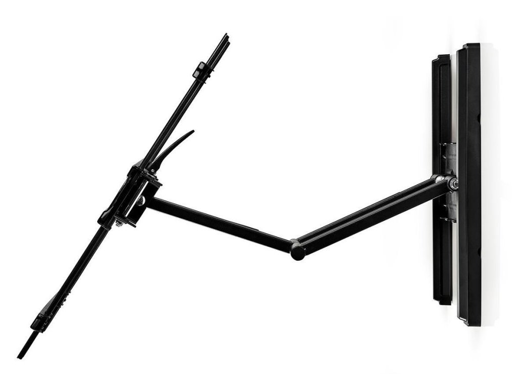 Držák využívá dvojramenný design se třemi otočnými body, který poskytuje maximální flexibilitu při nastavování polohy televizoru. Můžete televizor vysunout až 650 mm od stěny, otočit doleva nebo doprava až o 180° a naklonit pro eliminaci odlesků.