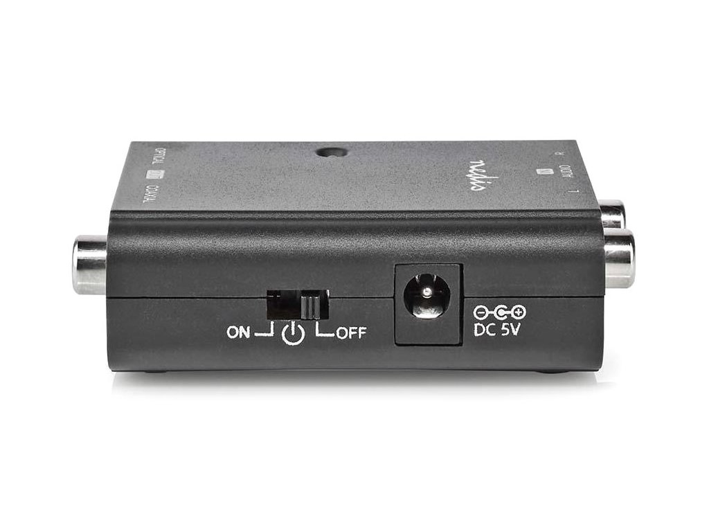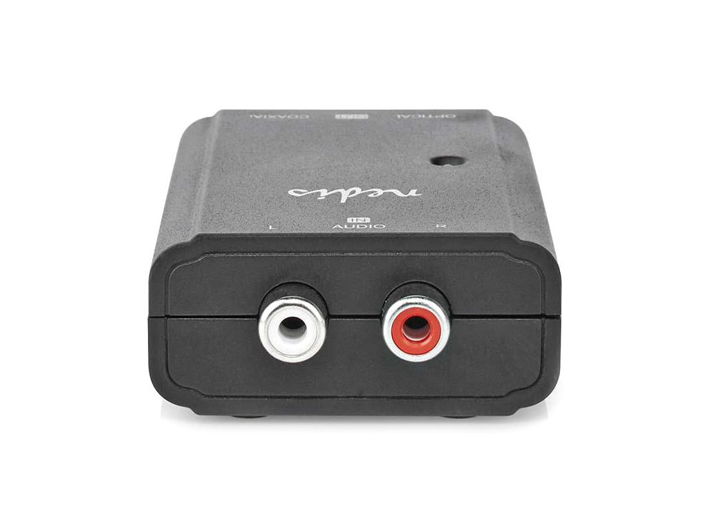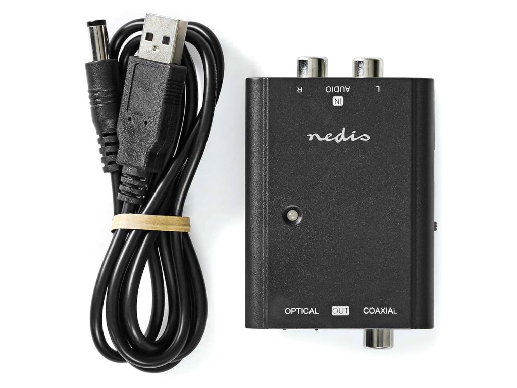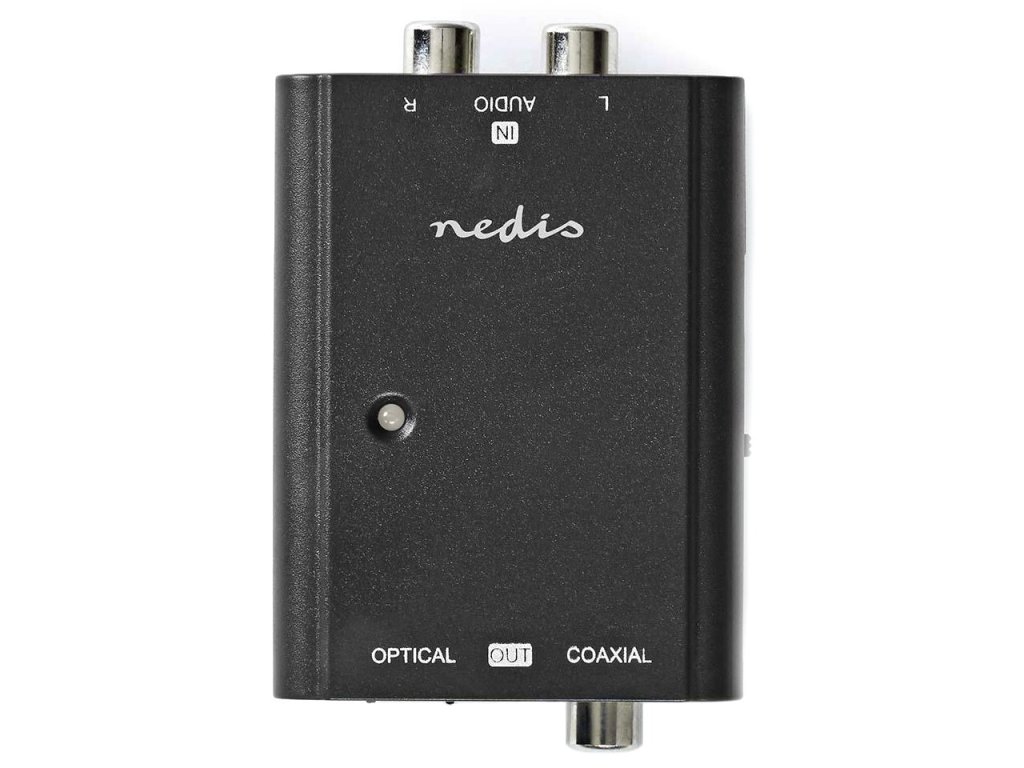 Nedis ACON2508BKTento digitální audio převodník převádí analogový stereofonní zvukový signál na digitální Toslink nebo RCA zvukový signál na vstupním portu přijímače nebo zesilovače. Dodává se s nabíjecím kabelem DC-USB (adaptér není součástí balení).