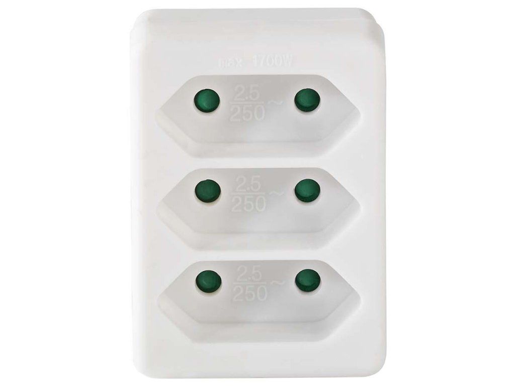 Rozbočovač je vyroben z kvalitního PVC materiálu v bílém provedení a nevyžaduje žádné kabely – zapojuje se přímo do zásuvky. Maximální výkon 1700 W při proudu 2,5 A zajišťuje bezpečné napájení běžných domácích spotřebičů a elektroniky.