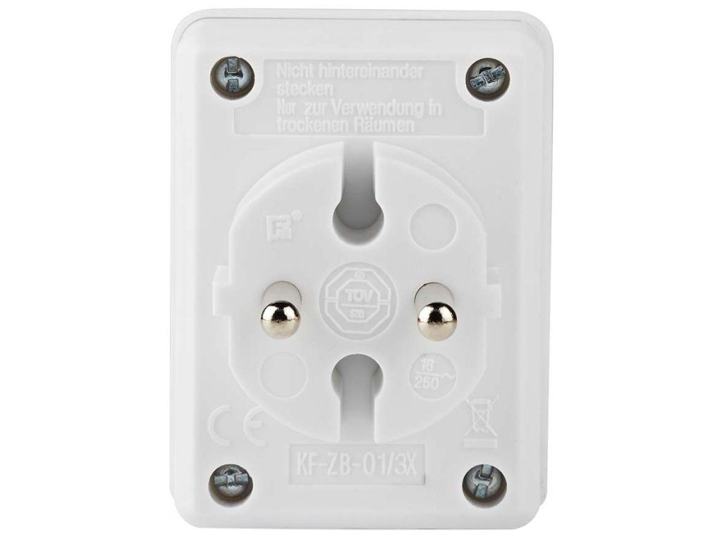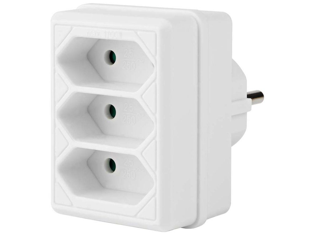 Praktický adaptér umožňuje rozdělit jednu nástěnnou zásuvku typu F (CEE 7/7) se zemnicím kontaktem na tři samostatné zásuvky typu C (CEE 7/16). Díky kompaktním rozměrům 48 × 66 × 76 mm a hmotnosti pouhých 62 g nezabírá mnoho místa a lze jej snadno přenášet.