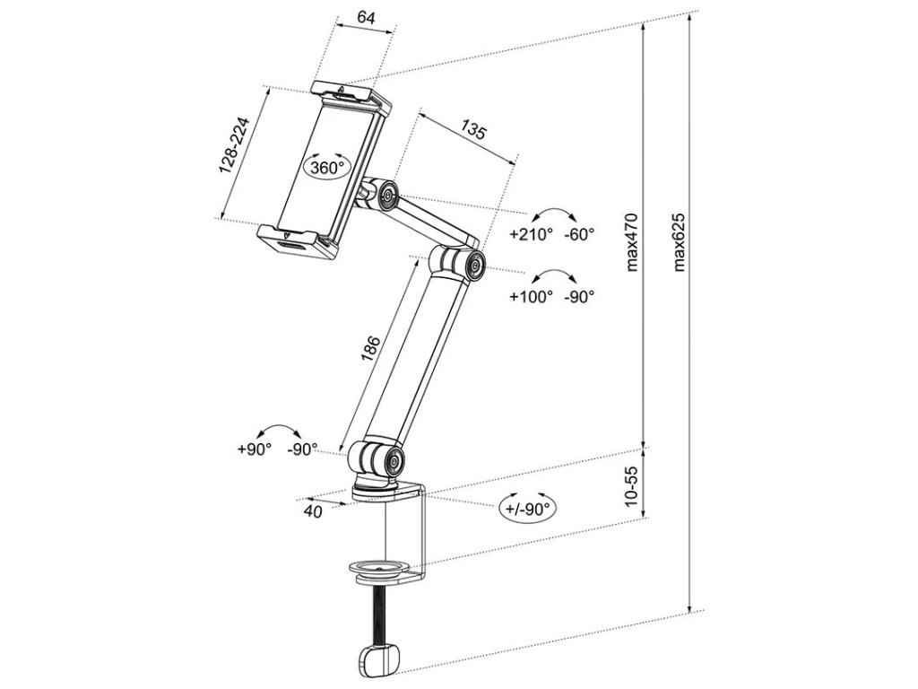 Neomounts DS15-545BL1Stolní držák pro tablet s úhlopříčkou 4,7" až 12,9" umožňuje pohodlné nastavení výšky, náklonu v rozsahu 270°, otáčení v rozsahu 104° a rotaci 360°. Měkké gumové podložky chrání zařízení před případným poškrábáním a pevná základna s protiskluzovými silikonovými podložkami zajišťuje pevné umístění.