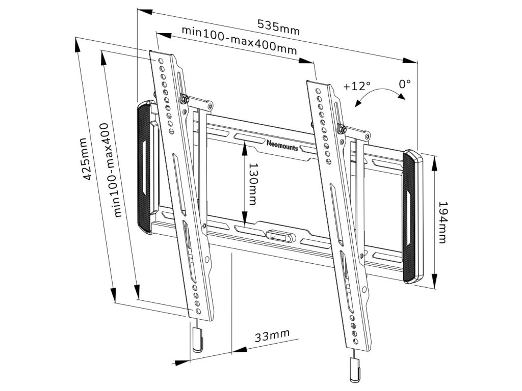 Neomounts WL35-550BL14Naklápěcí nástěnný držák pro ploché obrazovky s úhlopříčkou od 32" do 65" a hmotností až 60 kg. Držák má hloubku 3,3 cm a je vhodný pro obrazovky, které odpovídají vzoru otvorů VESA 100 × 100 až 400 × 400 mm. K dispozici je praktický magnetický systém pro vytažení/uvolnění a integrovaná vodováha, která zajišťuje snadnou instalaci.