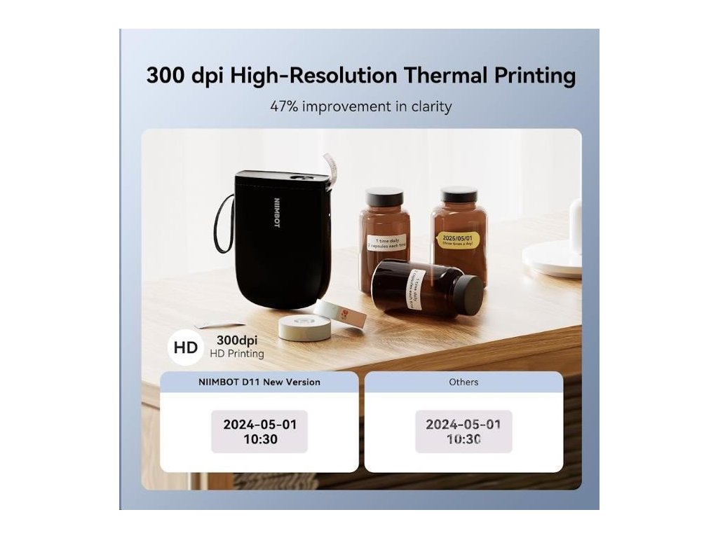 Tlačiareň D11-H ponúka vyšší nabíjací výkon, takže jej 1500mAh batéria je pripravená už za 1-2 hodiny. Tlačiareň vydrží v neprerušenom prevádzke až 5 hodín. Nový Bluetooth modul podporuje pripojenie až 6 zariadení a je tak ideálny pre zdieľanie v domácnosti alebo kancelárii. Novinkou je, že tlačiareň ponúka rozlíšenie 300 dpi pre skutočne verný tlač obrázkov. D11-H tiež vie pri zakladaní novej pásky „nasávať“ vyčnievajúci prvý štítok pre 100% bezodpadový prevádzok.