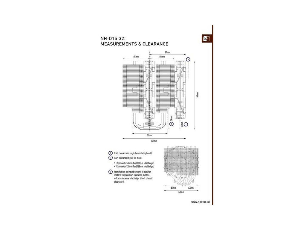 Väčší výkon, menšie rozmery - Vďaka vyššej hustote rebier, ktorú umožňujú nové ventilátory NF-A14x25r G2, ako aj asymetrickým komínom rebier a o niečo menšej medzere medzi komínmi, kombinuje verzia G2 lepší výkon s o niečo menšími rozmermi v porovnaní s pôvodným NH-D15 (o 9 mm menšia hĺbka chladiča, rovnaká šírka chladiča, rovnaká celková výška vrátane ventilátorov).