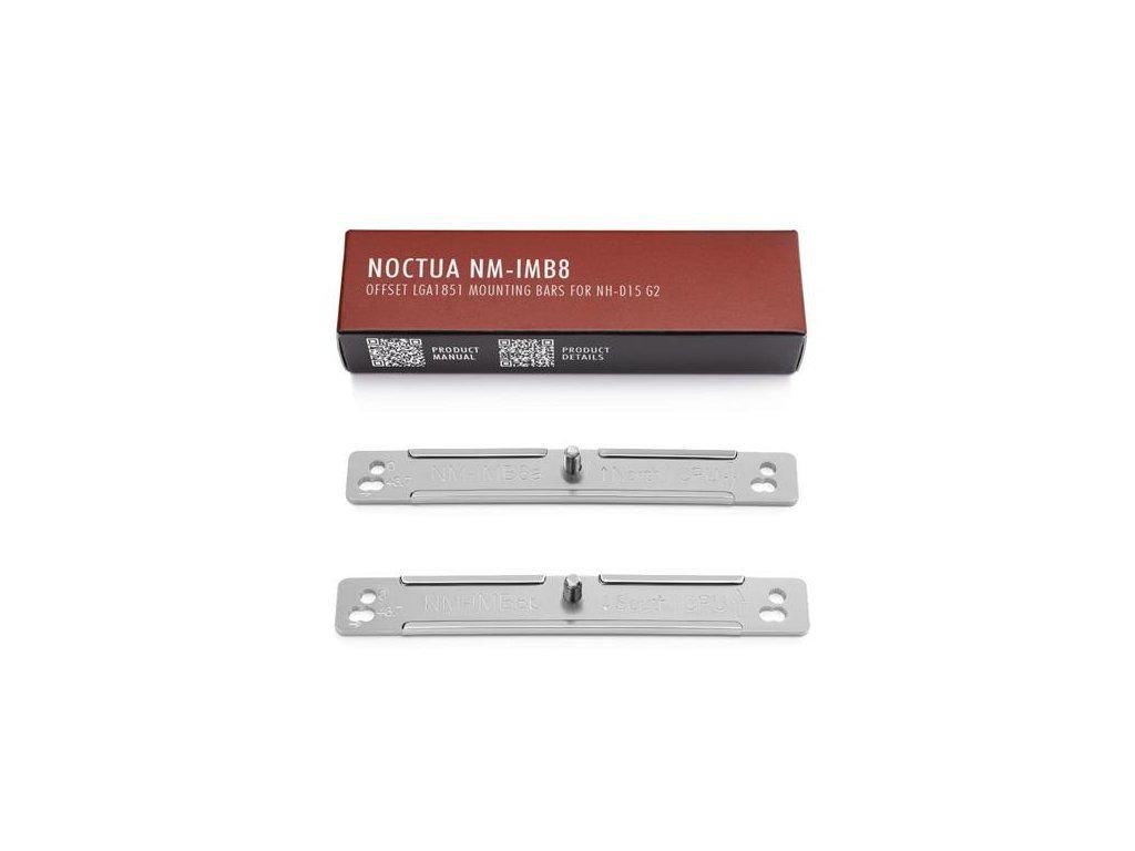 NM-IMB8 sú ofsetové montážne lišty LGA1851 pre NH-D15 G2. Posunutím chladiča o 3,7 mm smerom na sever a 2 mm smerom na východ od pätice sa zvýši tlak priamo nad horúcim bodom procesorov Intel® 24- alebo 20-jadrových procesorov LGA1851, ako sú Core® Ultra 9 285K alebo Core Ultra 7 265K.Tento vylepšený kontakt presne v mieste najvyššej teploty procesora môže znížiť teplotu procesora až o 3 °C s chladičmi HBC a až o 1 °C so štandardnou verziou (stredná konvexita základne) modelu NH-D15 G2. Keďže štandardná verzia má zvyčajne o 2 °C lepší výkon ako verzia HBC, ak sa obe používajú bez posunu, prvá verzia zostáva odporúčanou voľbou pre LGA1851, pretože dosahuje celkovo najlepšie teploty, a to aj s montážnymi lištami s posunom, aj bez nich.