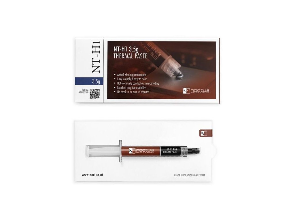 Noctua NT-H1 je teplovodivá pasta od už renomovaného výrobcu chladičov a príslušenstva. Hybridná pasta sa skladá z micro-častíc, ktoré umožňujú výborný prenos tepla, veľmi jednoduché použitie / aplikovanie a veľmi dlhú dobu stability.Pasta je mazľavá - veľmi dobre sa rozotiera bez väčšieho tlaku. Po použití nie je potrebné zahorenie - pasta má svoje vlastnosti okamžite pri použití. Neobsahuje žiadne rozpúšťadlá a tak ma výbornú trvácnosť - jej použitie je dlhoročné bez straty svojich vlastností.
